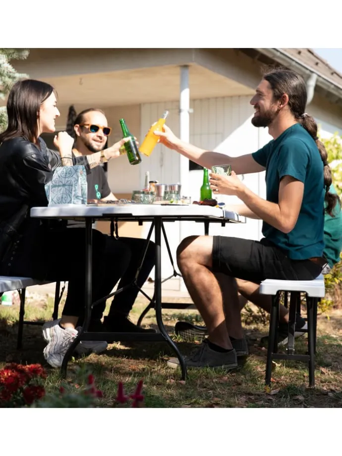 Die Bierzeltgarnitur sorgt auf Ihren Geburtstagsfeiern und Grillparties für ausreichend Sitzplätze. Bänke und der Tisch sind an den Füßen mit Gummischonern versehen, sodass Sie die Möbel auch im Innenbereich, zum Beispiel auf Fliesen, stellen können.