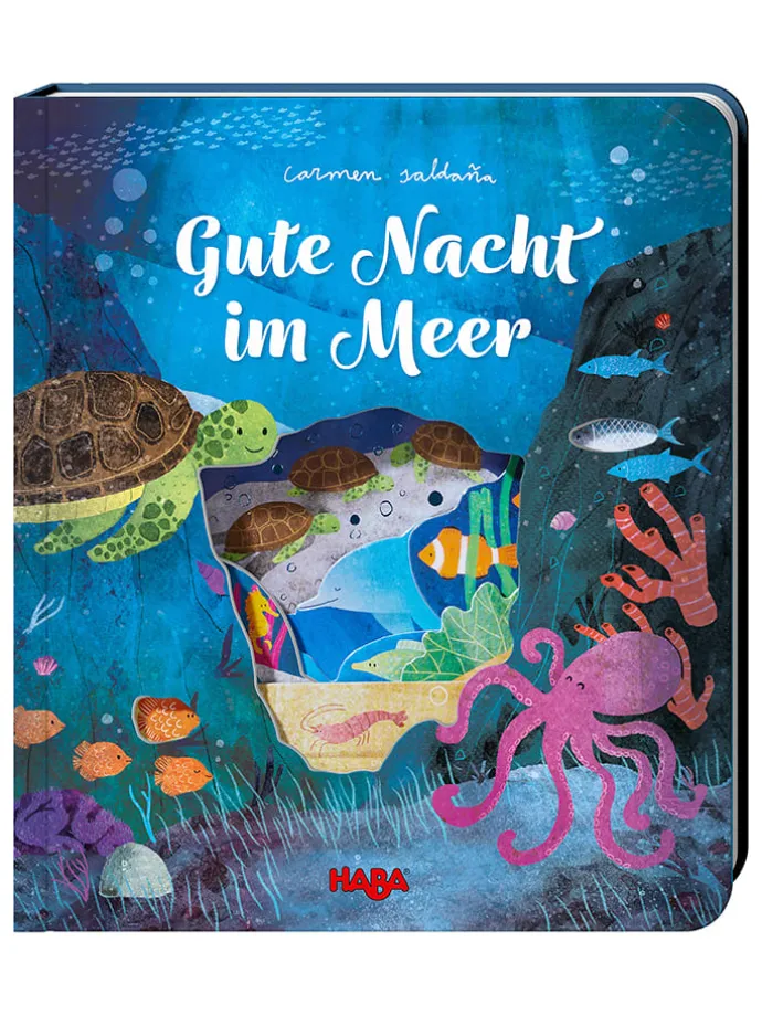 Wer schlummert nachts im Meer? Gemeinsam mit Fischen, Schildkröte und Qualle gehen die Kinder auf eine Reise durch die abendliche Natur. Ob am Meeresboden oder an Korallenriffen – überall gibt es Tiere zu entdecken und so manches über sie zu erfahren. Das wunderschön illustrierte HABA-Pappbilderbuch „Gute Nacht im Wald“ der Autorin und Naturliebhaberin Becky Davies nimmt Kinder ab 2 Jahren mit auf eine nächtliche Entdeckungstour durchs Meer und vermittelt auf kindgerechte Weise erstes Sachwissen. Dank Gucklöcher ist der Spaß beim Erkunden besonders groß!