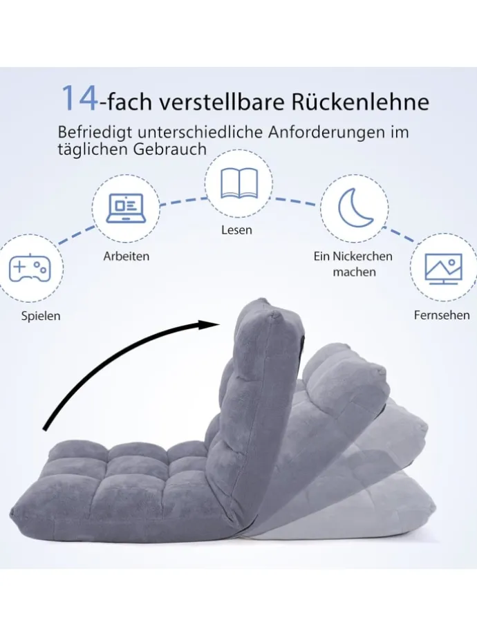 Die Rückenlehne von dem Lazy-Sofa kann in 14 verschiedenen Positionen fixiert werden, sodass Sie mit Sicherheit Ihre Lieblingsposition finden können. Ob im Sitzen oder Liegen, mit dem Bodenstuhl können Sie sich nicht nur im Wohnzimmer vor dem TV oder beim Lesen richtig bequem machen. Der gepolsterte Bodenstuhl ist auch hervorragend als Sitzgelegenheit zum kreativen Arbeiten im Büro geeignet.