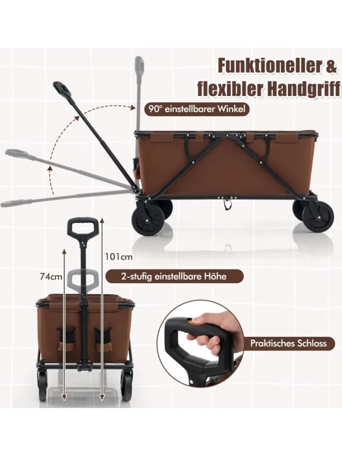 Er verfügt über ein beachtliches Fassungsvermögen von 170 l und bietet Platz für eine Vielzahl von Gegenständen von Werkzeugen bis hin zu Topfpflanzen. Er wird von einem robusten Metallrahmen und hochwertigem Oxford-Gewebe für Langlebigkeit getragen. Dieser Wagen lässt sich mühelos zusammenklappen und in der mitgelieferten Tragetasche verstauen, sodass er sich perfekt für effiziente Lagerung und Transport eignet. Er verfügt über einen verstellbaren Lenker, geländegängige Räder für reibungslose Bewegung auf unterschiedlichen Oberflächen und zusätzliche Aufbewahrungsmöglichkeiten wie Flaschenhalter und eine Seitentasche. Gestalten Sie Ihre Outdoor-Aktivitäten angenehmer mit diesem vielseitigen und zuverlässigen Wagen.