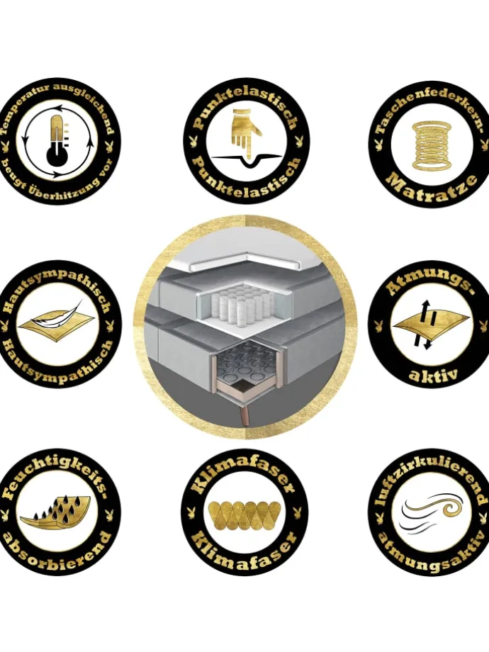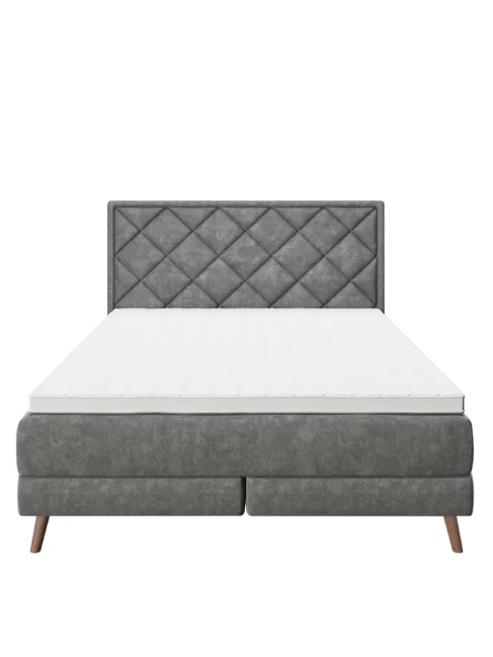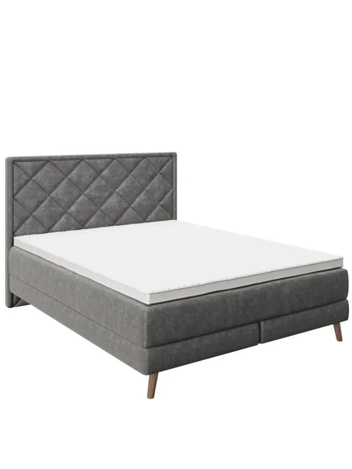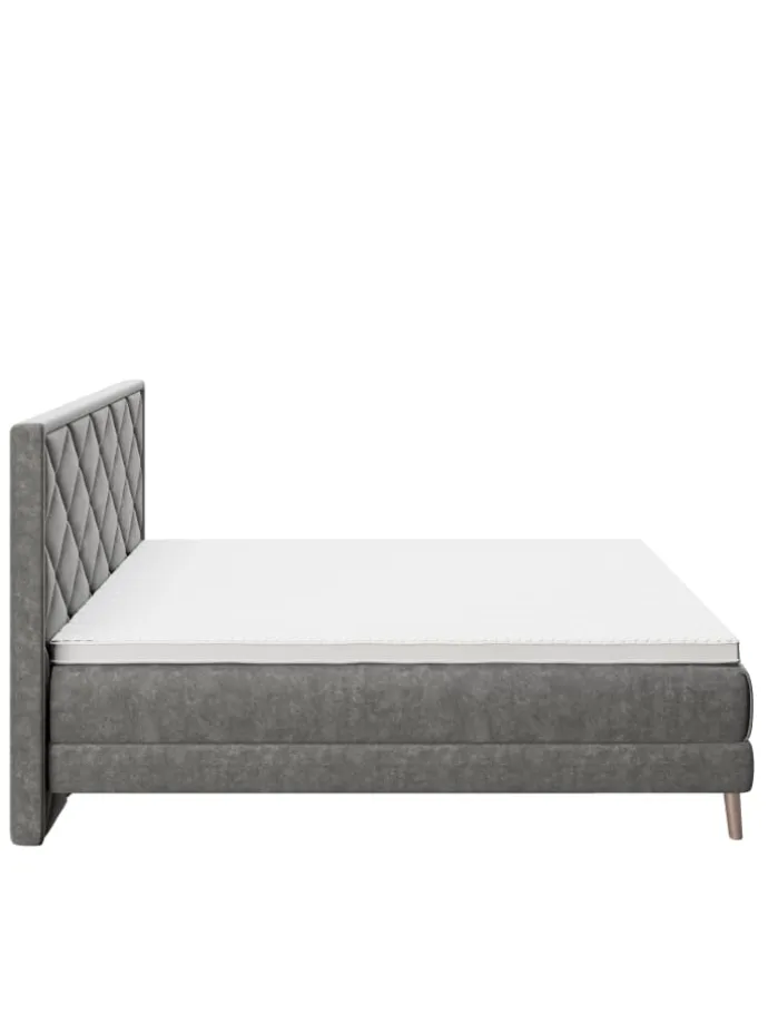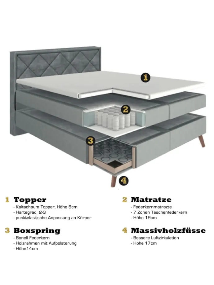 Das Boxxspringbett „Audrey“ aus der PLAYBOY-HOME Kollektion ist im Club-Stil der 60er Jahre gehalten. Das gepolsterte Kopfteil aus grauem Samtstoff mit Diamond-Stitching runden das Retro-Design vollkommen ab. Das hochwertige Bett mit einer Liegefläche von 140×200 ist mit einem Kaltschaum-Topper, Härtegrad 2-3, 7-Zonen Taschenfederkernmatratze, Bonell-Federkern, Holzrahmen und Massivholzfüssen ausgestattet. Die weiche Rückenlehne und der Kaltschaumtopper passt sich punktelastisch an und sind auch nach langem Sitzen und Liegen noch sehr bequem. Aktive Belüftungskanäle verhindern Wärmestau und ermöglichen eine perfekt temperierte Komforauflage. Das perfekte Bett für Ihren gesunden Schlaf. Der Bettrahmen ist aus pflegeleichtem Samtstoff und schadstoffgeprüftem Schaumstoff. Alle Artikel der PLAYBOY-HOME Kollektion sind farblich und im Design aufeinander abgestimmt. Alle Möbel und Accessoires ergeben zusammen ein wertiges Gesamtkonzept. Material: Schaumstoff, Polyester, Matratze, Topper, Massivholz