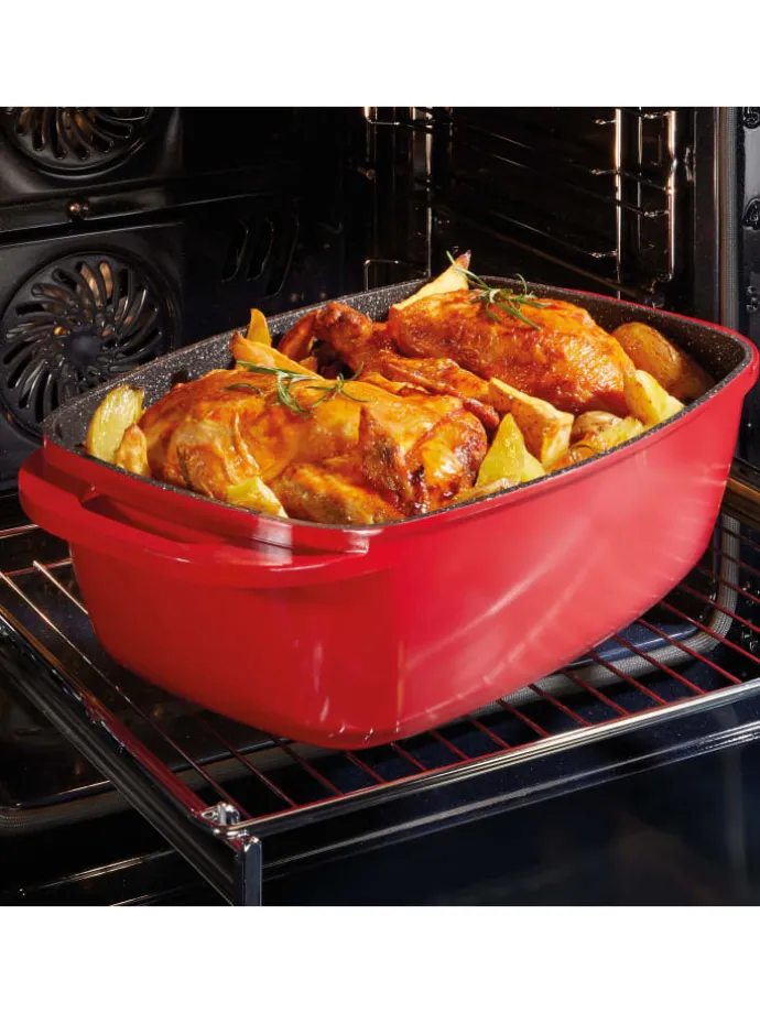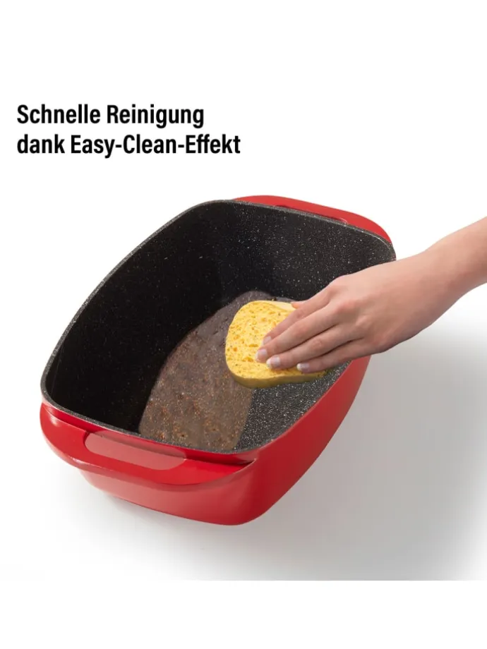 Die XXL Größe bietet genügend Platz für Ihre Wunschgerichte. Der Bräter ist ideal für die Zubereitung von Fleisch- und Geflügelbraten, von Lasagne, Aufläufen, Gratins, Kuchen, Brot und vielem mehr.