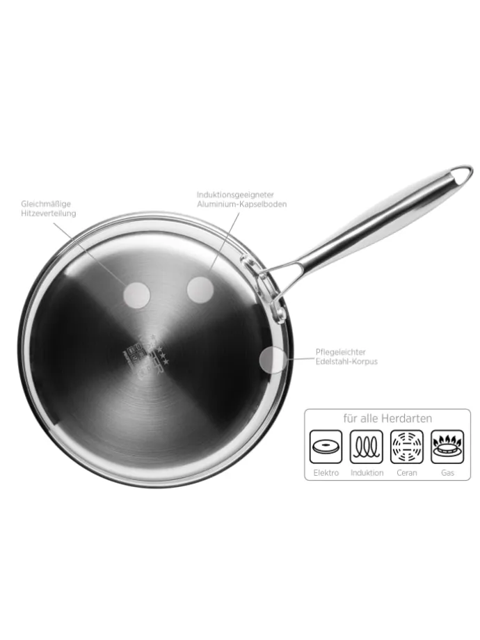 – Die Edelstahl Pfanne besteht aus 3 Schichten: die Innen- und Außenseite aus rostfreiem Edelstahl 18/10 umschließen den Aluminium-Kapselboden im Kern