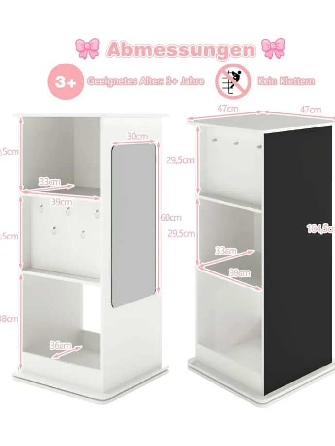 Verwandeln Sie das Kinderzimmer mit unserem vielseitigen drehbaren Bücherregal! Sehen Sie, wie es sich sanft dreht und Ihren Kleinen mühelosen Zugang zu Büchern, Spielzeug und sogar einer großen Tafel für angehende Künstler ermöglicht! Mit jeder Drehung macht das Aufräumen Spaß. Sicherheit trifft auf Stil – dieses freistehende Kinderbücherregal verfügt über abgerundete Ecken und bruchsichere Spiegelflächen. Das Standregal für Kinder ist perfekt für kleine Entdecker, die ihre Lieblingssachen selbstständig holen möchten. Hinweis: Nicht zum Klettern geeignet für Kinder.