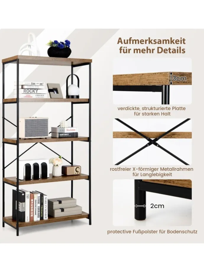 Dieses Bücherregal mit 5 offenen Regalen bietet ausreichend Stauraum für verschiedene Gegenstände. Sie können problemlos Bücher, Schachteln, Geschirr oder Deko darin verstauen. Dieses Mehrzweckregal kann nicht nur als Bücherregal im Arbeitszimmer/Büro verwendet werden, sondern dient auch als Aufbewahrungsorganisator für die Küche oder als Präsentationsregal für das Wohnzimmer. Während des Gebrauchs verhindern die Kippsicherungen, dass dieses Lagerregal umkippt. Jedes Bein ist mit rutschfesten Fußpolstern ausgestattet, um ein Verrutschen auf dem Boden zu verhindern. Dieses Bücherregal im Industriestil verleiht Ihrem Zuhause eleganten Charme. Sie können es in Ihrem Wohnzimmer, Arbeitszimmer, Schlafzimmer und Büro aufstellen.