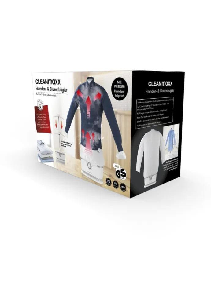 Goodbye, Bügeln! Endlich mehr Zeit für dich. Der CLEANmaxx Hemdenbügler PRO glättet und trocknet Oberbekleidung wie Hemden oder Shirts innerhalb kürzester Zeit – und das ganz von allein! Dabei setzt der vollautomatische Bügler auf hohe Effizienz mit kraftvollen 1800 Watt. Die clevere Heißluft-Technologie sorgt dann für perfekte Ergebnisse in ca. 10 Minuten, ob bei Hemden, Blusen, T-Shirts oder Pullovern.