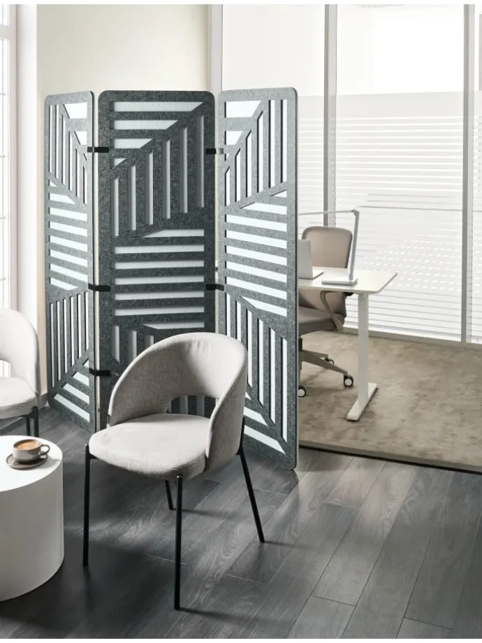 Faltbare Trennwand mit dekorativen Ausschnitten. Verleihen Sie Ihrem Arbeitsbereich mit dieser eleganten, 3-teiligen Trennwand einen Hauch von modernem Stil. Dank ihrer klaren Linien und geometrischen Ausschnitte bietet sie sowohl Privatsphäre als auch optische Raffinesse und eignet sich somit ideal, um in Gemeinschaftsbereichen einen persönlichen Raum zu schaffen. Dank ihres leichten Designs lässt sie sich bei Bedarf leicht verschieben und neu anordnen.