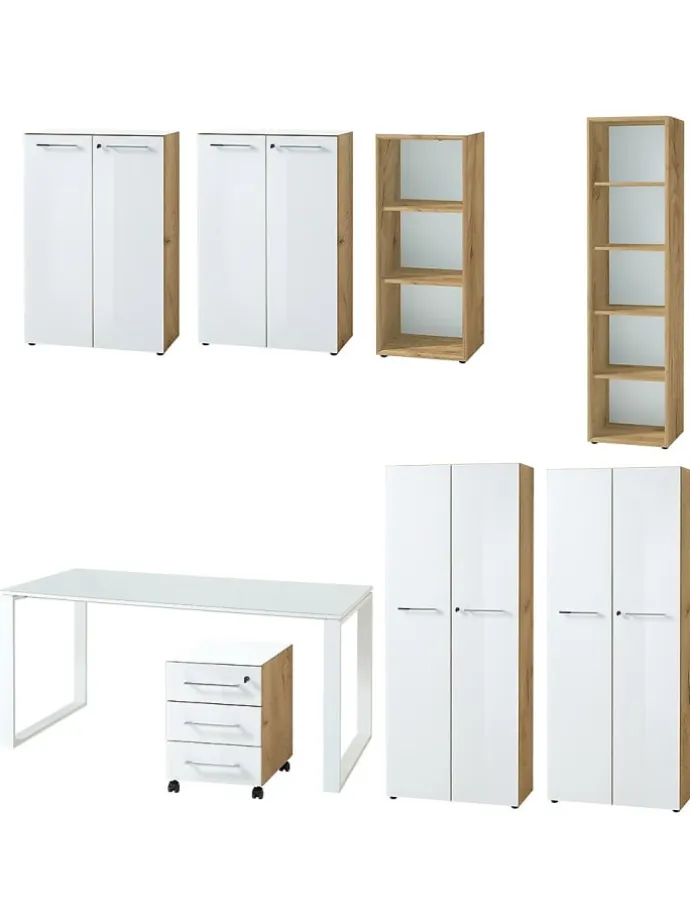 Büromöbel-Set bestehend aus einem Schreibtisch, einem Rollcontainer, zwei halbhohen und zwei hohen Aktenschränken sowie einem halbhohen und einem hohen Aktenregal; Schreibtisch mit pulverbeschichteten Metallkufen und Glasauflage (belastbar bis zu 30 kg); Rollcontainer auf Laufrollen mit drei Schubladen, davon eine abschließbar; halbhohe, abschließbaren Aktenschränken, mit zwei festen Einlegeböden; hohe, abschließbare Aktenschränke mit vier festen Einlegeböden; halbhohes Aktenregal mit zwei festen Einlegeböden und hohes Aktenregal mit vier festen Einlegeböden; insgesamt elf verchromte Relinggriffe aus Metall; insgesamt 24 schwarze Möbelgleiter; mit Glasfronten und -auflage; Korpus in Navarra-Eiche-Nb., Glaselemente in Weiß; Melaminharzbeschichtung, Hochwertige ABS-Kanten, Türdämpfung, Selbsteinzug der Schubladen, Made in Germany.