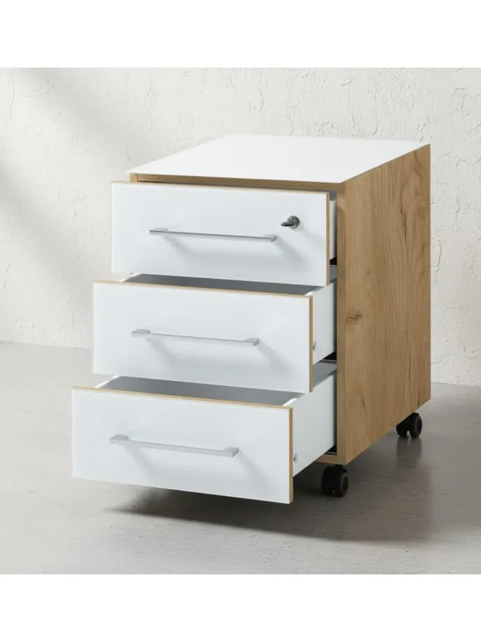 1x Rollcontainer (40 x 50 x 55 cm): 3 Schubladen (Soft-Close), abschließbar, mobil auf Rollen.