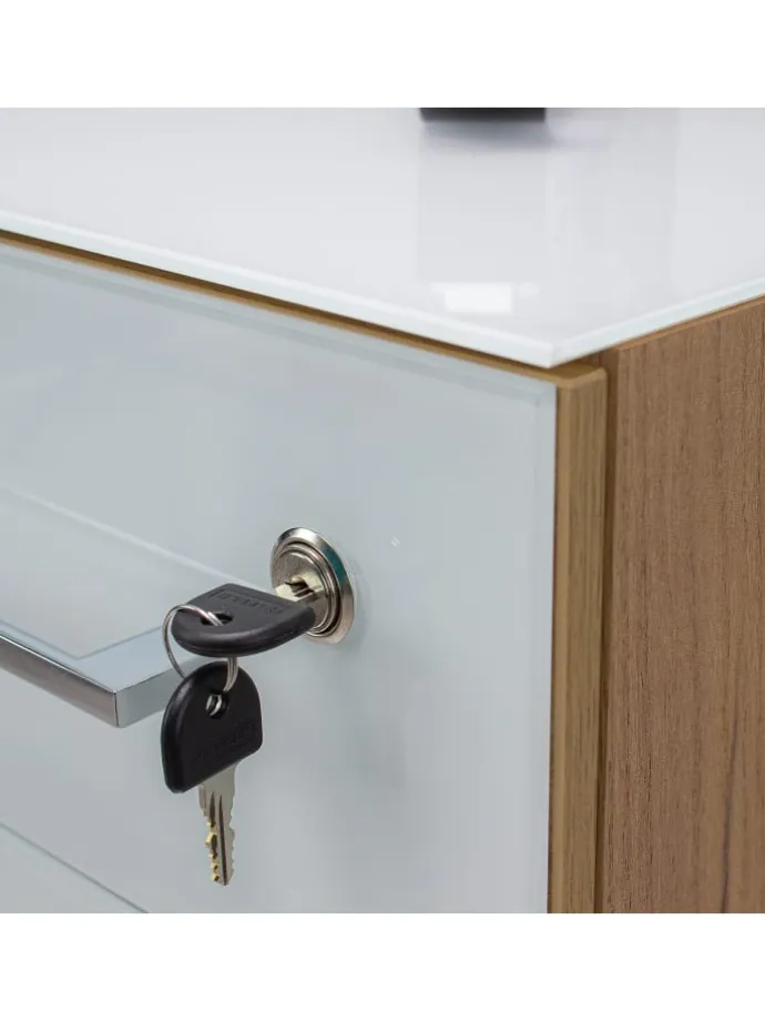 Dieses Set bietet nicht nur enormen Platz für Akten, sondern schützt diese auch: Alle Schränke und der Container sind abschließbar. Dank der Soft-Close-Technologie schließen Türen und Schubladen sanft und geräuschlos. Die Kombination aus hohen und halbhohen Elementen lockert die Optik auf und schafft zusätzliche Ablageflächen auf den Midi-Schränken.