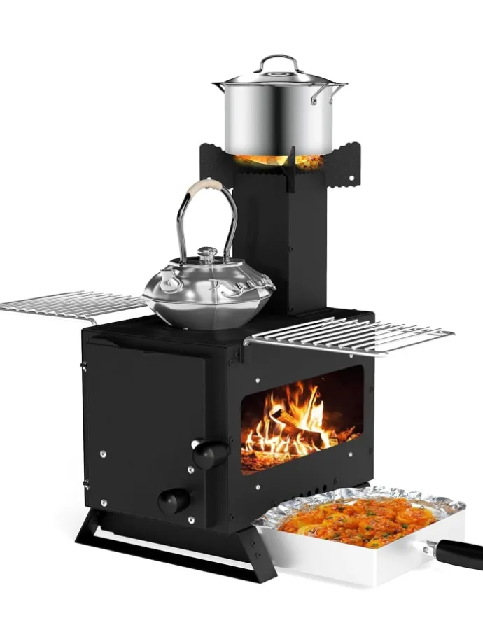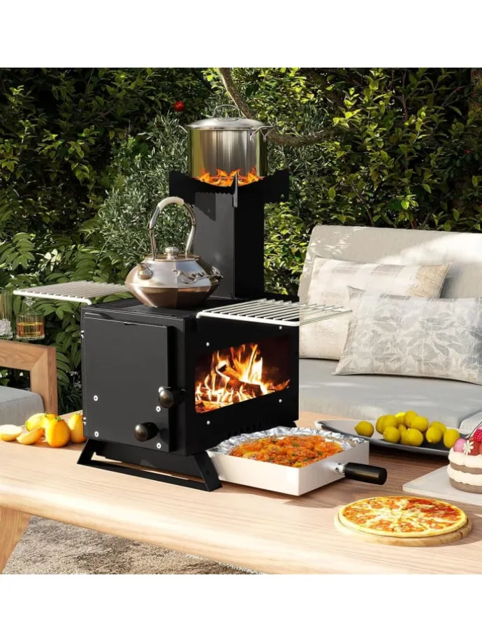 Dieser kompakte Ofen verfügt über 3 verschiedene Kochbereiche: ein X-förmiges Topfgestell, eine Arbeitsplatte mit abnehmbarem Deckel und eine spezielle Ofenpfanne. Einschließlich 2 anpassbare Seitenroste, die auch als Kochstützen dienen, bietet der Holzofen mehr Vielseitigkeit. Hauptsächlich aus robustem SPCC konstruiert, garantiert dieser Outdoor-Ofen Langlebigkeit und Sicherheit. Mit dem glaskeramischen Sichtfenster und der benutzerfreundlichen Luftsteuerung ist die Überwachung und Anpassung der Verbrennung einfach. Ideal für Camping, Wohnmobilreisen oder kühne Winterausflüge, vereint dieser Metallofen Wärme mit kulinarischem Können und ist eine großartige Ergänzung Ihrer Outdoor-Ausrüstung für alle Jahreszeiten.