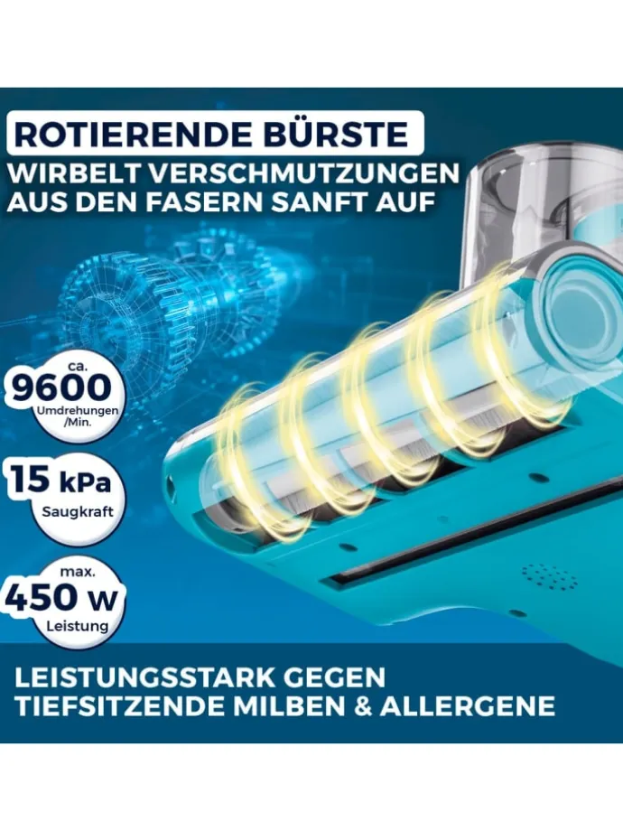 Endlich wieder erholsam schlafen! Der CLEANmaxx Milbensauger Rotation Power befreit Bettwäsche-, Betten-, Kinderbetten-, Matratzen-, Kopfkissen-, Polstermöbel-Oberflächen und mehr von 99,9 % aller Milben. Sichtbare sowie versteckte Allergene werden mit einer Saugkraft von bis zu 15 kPa zuverlässig entfernt.