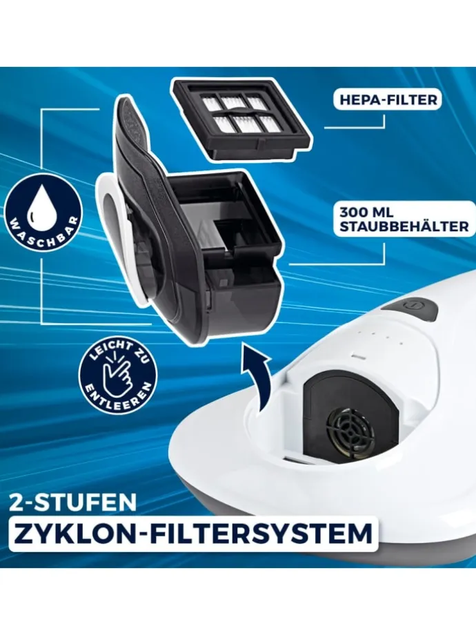 Zum eigenen Schutz wird das UV-C-Licht erst bei der Berührung mit Oberflächen aktiviert. Der CLEANmaxx Milbensauger Vibration ist mit einem hocheffizienten 2-Stufen-Zyklon-Filtersystem ausgestattet. Der waschbare HEPA-Filter fängt selbst kleine Partikel auf und sorgt für eine saubere und gesündere Umgebung.