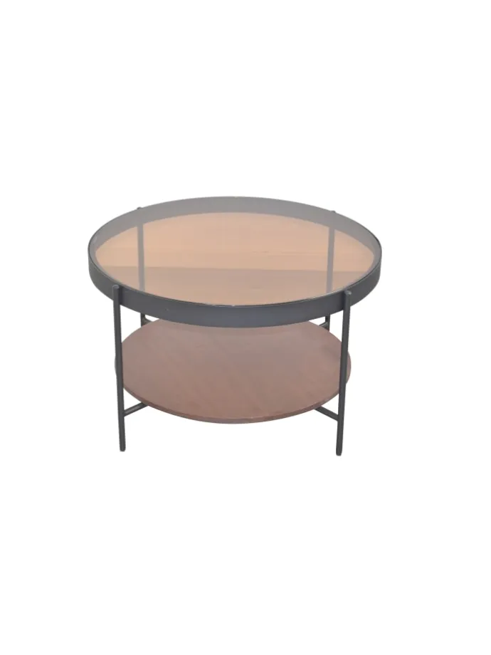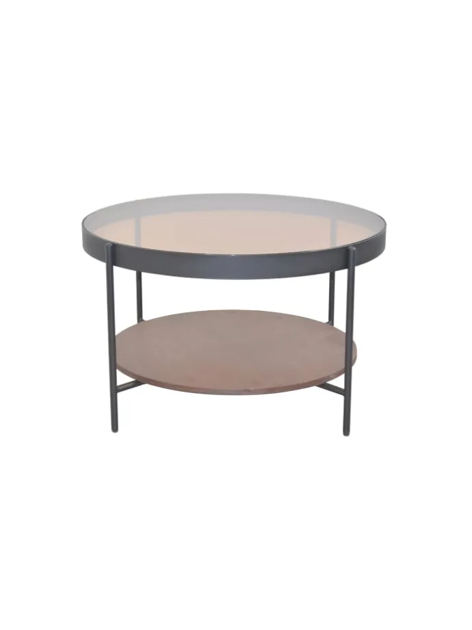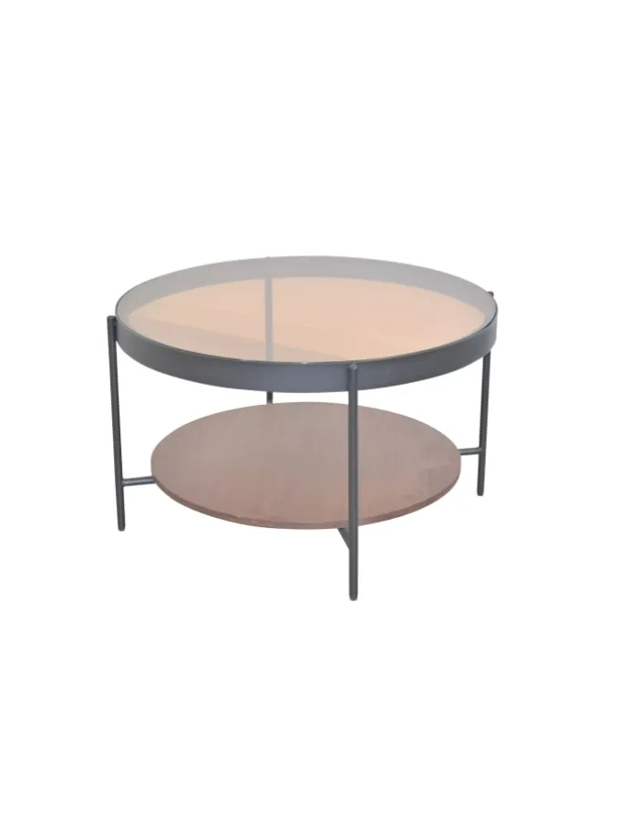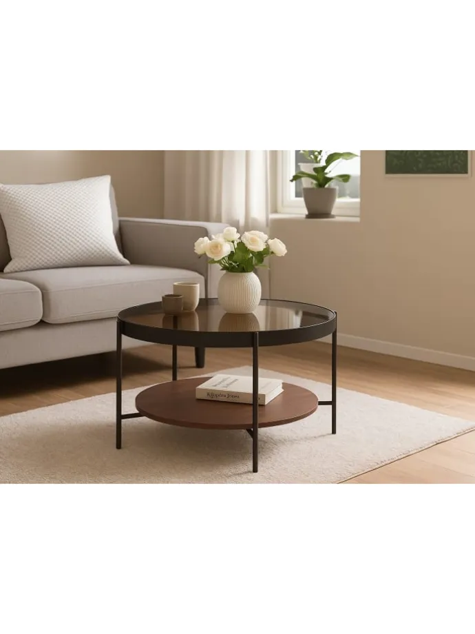 – Modernes Design: Runde Form mit edlem Materialmix – Metall, Glas und MDF