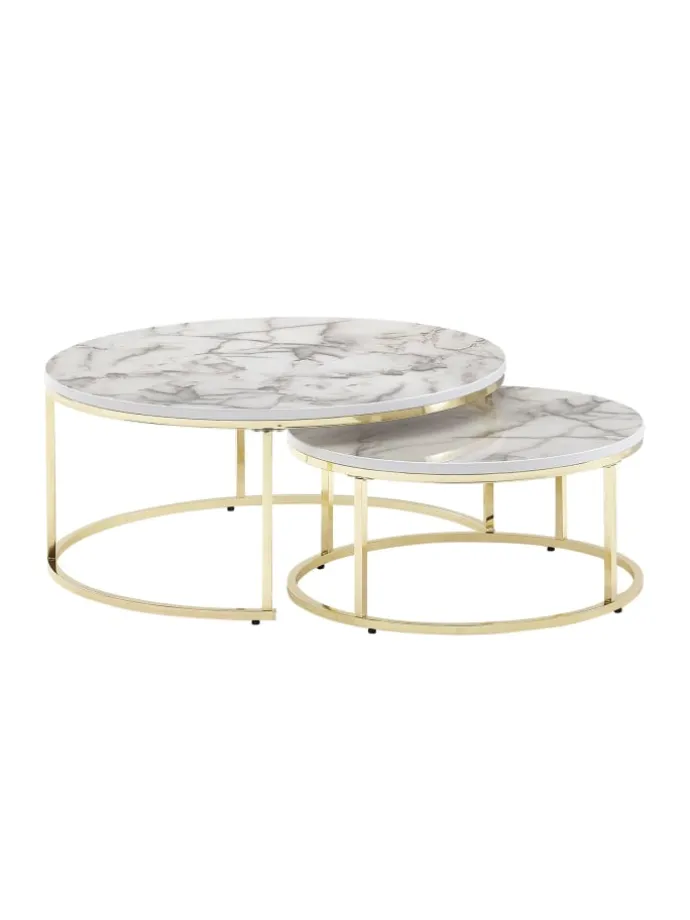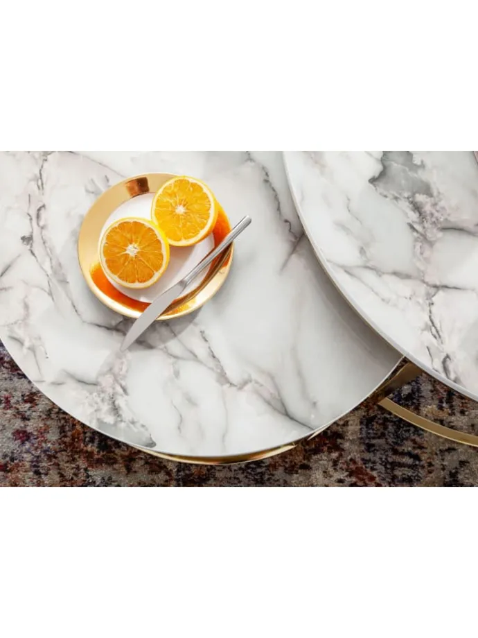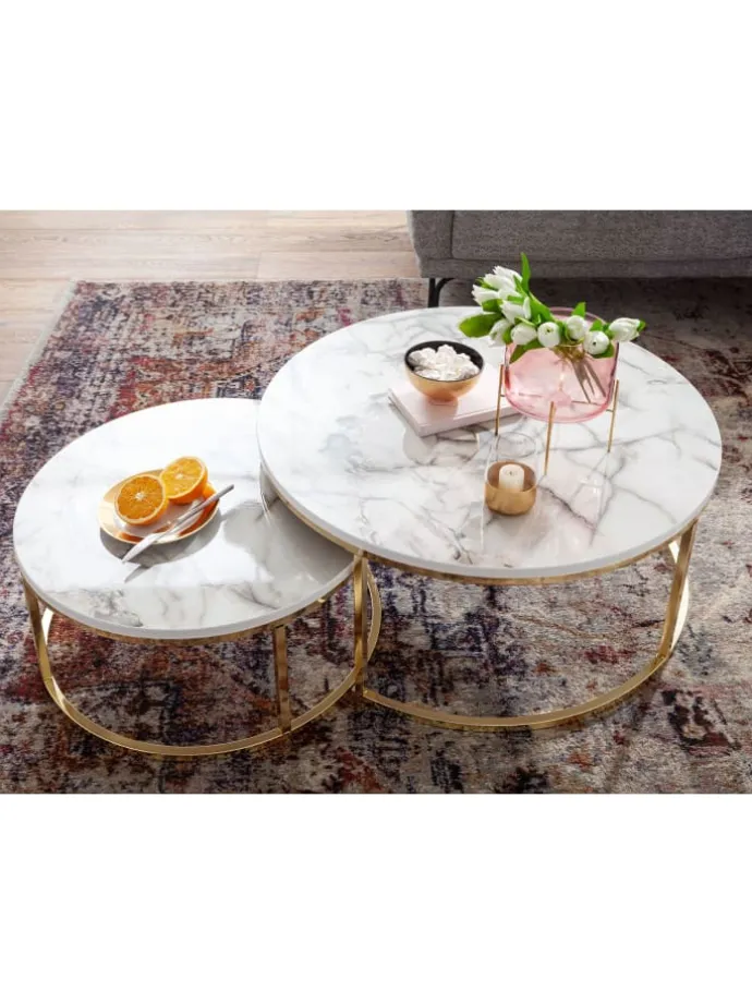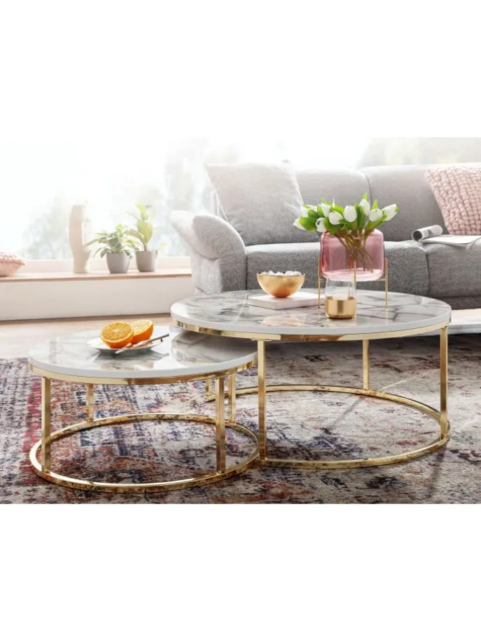 Design Zwei runde Couchtische in modernem Design Tischplatten stechen durch die edle Marmor Optik hervor Farbig lackierte Metallgestelle Abmessungen Großer Tisch Breite: 80 cm Tiefe: 80 cm Höhe: 36 cm Tischplattenstärke: 2 cm Maximale Belastbarkeit: 10 kg Kleiner Tisch Breite: 60 cm Tiefe: 60 cm Höhe: 26 cm Tischplattenstärke: 2 cm Maximale Belastbarkeit je Tisch: 8 kg Besonderheiten Die Ablageflächen bieten genügend Platz für Getränke, Snacks und Fernbedienungen Fester Stand dank der robusten Tischgestelle aus Metall Anti-Rutsch-Noppen schützen Ihren Fußboden und das Metall vor unschönen Kratzern Tische lassen sich platzsparend ineinanderschieben Sowohl im Set als auch einzeln verwendbar Material Tischplatten: foliertes MDF (mit Polyresin-Beschichtung) Gestelle: lackierter Stahl Lieferumfang Zwei Couchtische ohne Dekoration Montageanleitung und -material liegen der Lieferung bei Montage Lieferzustand: zerlegt und praktisch verpackt Pflegehinweise Die Oberfläche am besten mit einem lauwarmen, leicht angefeuchteten Baumwolltuch abwischen und Restfeuchtigkeit mit einem fusselfreiem Lappen entfernen.