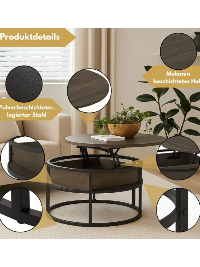 Der Couchtisch Swing eignet sich gut für Wohnzimmer, Schlafzimmer oder für Homeoffice – dank seiner kompakten Maße und seines dezenten Looks überall rein. Mit einem Durchmesser von 80 cm und einer Höhe von 62 cm (ausgeklappt) bietet er optimale Größe bei gleichzeitig platzsparendem Design. Du hast die Wahl zwischen edlem Grau und warmem Braun, passend zu deinem persönlichen Wohnstil. Der SWING ist mehr als ein Tisch – er ist ein smartes Wohnaccessoire.