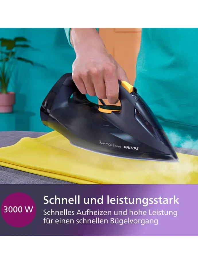 Das Philips DST7060/20 HV ist ein Dampfbügeleisen, das mit einer Leistung von 3.000 W für schnelles Aufheizen sorgt. Mit dem Quick Calc Release ist das Entkalken des Geräts kinderleicht und schnell erledigt. Der konstante Dampfausstoß von bis zu 55 g/min sorgt für eine effiziente und schnelle Bügelzeit. Sollte es mal besonders hartnäckige Falten geben, kann der Dampfstoß von bis zu 250 g genutzt werden, um diese mühelos zu entfernen.