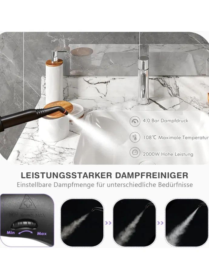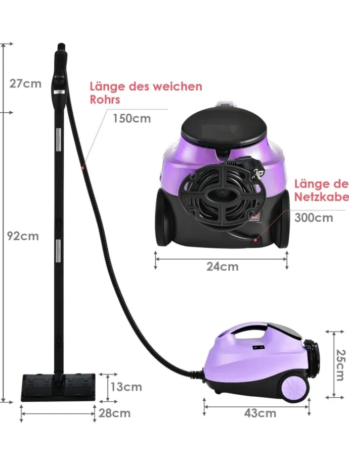 Dies ist unser zuverlässiger Dampfreiniger mit hoher Effizienz und Tiefenreinigungskraft. Zur Reinigung von Böden, Fenstern und Geräten hilft die hohe Temperaturen und der Dampfdruck enorm. Ohne chemische Arbeitsstoffe wird alles sauber und desinfiziert. Der 1,5-l-Wassertank mit kann in 5-6 Minuten auf 108 ° C aufgeheizen. Die Betriebszeit beträgt ca. 45 Minuten. Die Kindersicherung und die automatische Abschaltung sorgen dafür, dass Ihre Kinder und Haustiere sicher sind. Mit dem vielseitigen Zubehör können Sie Milben zu Hause, im Büro und im Auto entfernen.