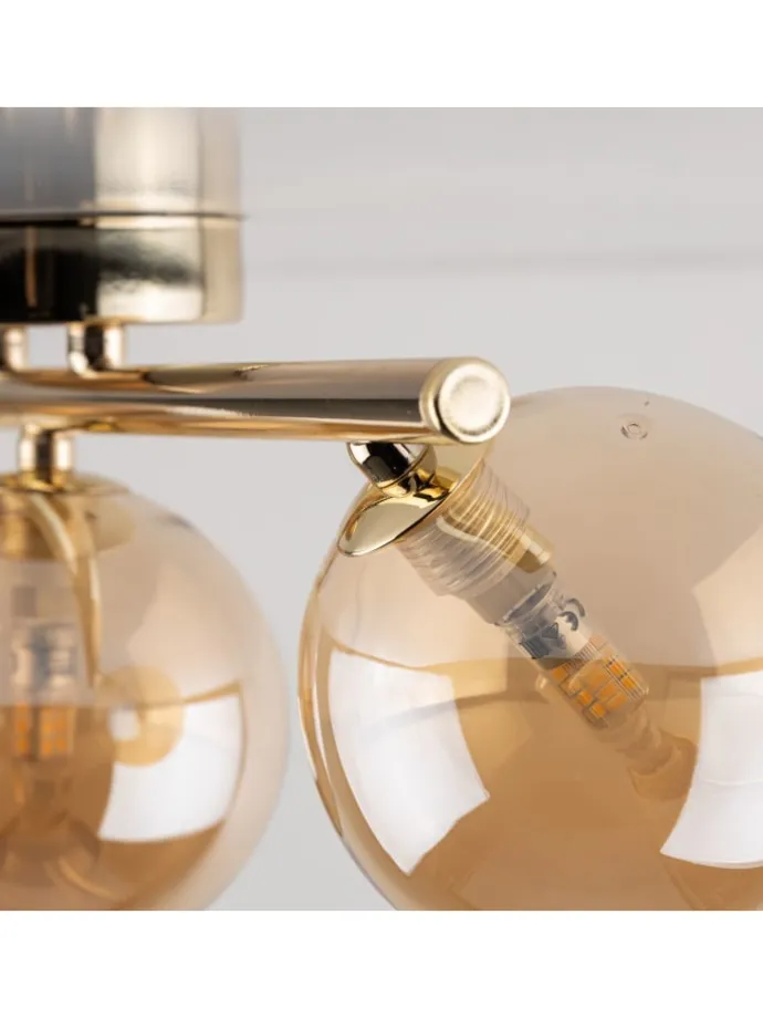 Fassung: 3x G9 bis 8W | Farbe: Gold, Bernstein | Material: Metall, Glas | Spannung: 230V | Spritzschutzklasse: IP20 | Elegante Deckenlampe mit Kugelschirmen aus Rauchglas | Das moderne Design setzt einen dekorativen Akzent und passt ideal in Wohnzimmer und Esszimmer | Auch als Beleuchtung in Hotels, Restaurants, Bars und Cafés ein stilvoller Hingucker | Dank ihrer geringen Höhe passt die Deckenlampe auch in kleine Räume mit niedrigen Decken | Freie Leuchtmittelwahl: Helligkeit und Lichtfarbe können durch selbst gewählte LED-Leuchtmittel variiert und auf jeden Raum abgestimmt werden | nicht inklusive | Qualität Made in EU | Achtung: Die kleinen Löcher in den Schirmen sind zum Entweichen der Wärme und stellen keinen Reklamationsgrund dar
