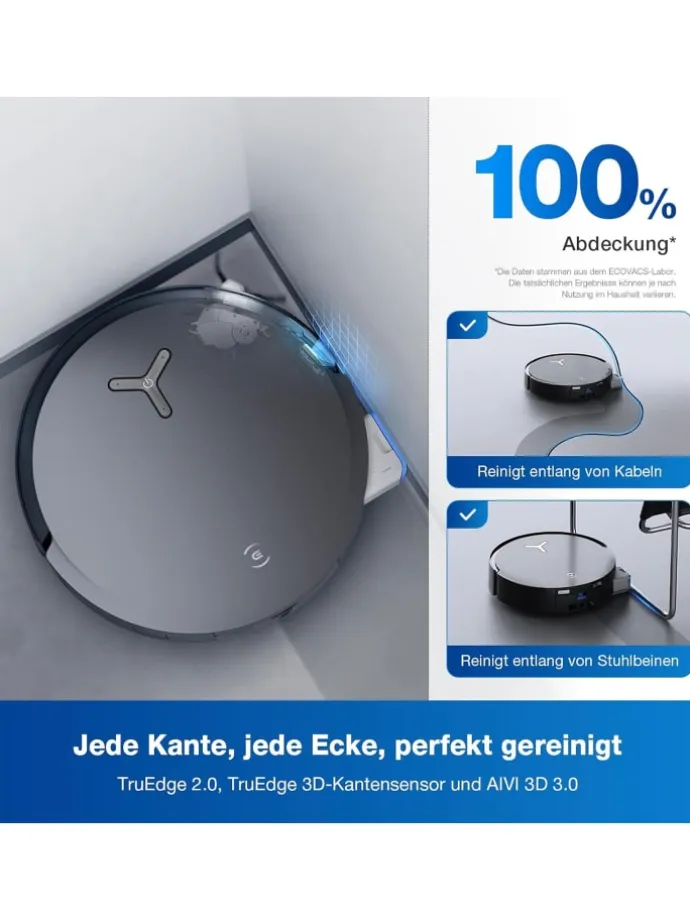 Die AIVI 3D 3.0 Technologie in Kombination mit dem 3D-Kantensensor erfasst Hindernisse und deren Konturen, sodass der DEEBOT entlang von Objekten reinigen kann, ohne zu kollidieren oder großen Abstand zu halten.
