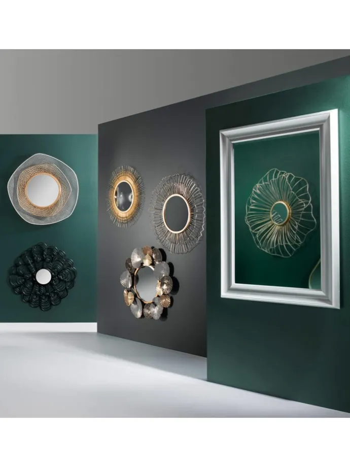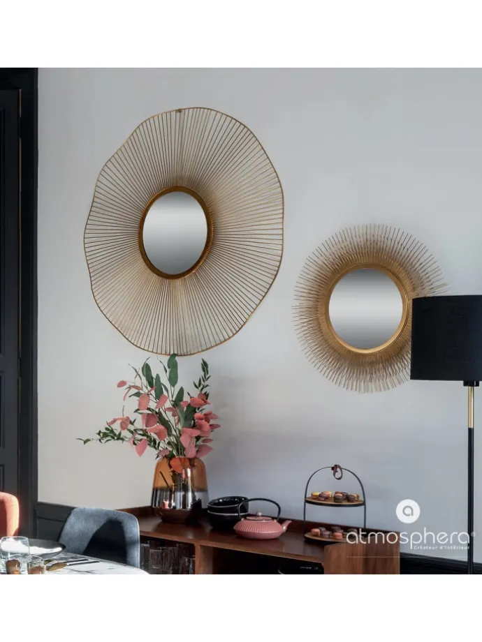 runde dekorative Spiegel SUN ist ein wunderschönes Design der vertrauenswürdigen französischen Marke Atmosphera. Der Spiegel hat eine supermodischige, kreisförmige Form und einen interessanten Rahmen. Ihre reich verzierte Form wird dem Interieur Charakter verleihen. Der präsentierte Spiegel funktioniert perfekt im Flur, Schlafzimmer oder Badezimmer. Dank Metall ist der Rahmen langlebig und widerstandsfähig gegen mechanische Beschädigungen, was in gewissem Maße auch die Spiegellampe selbst schützt.