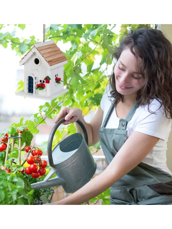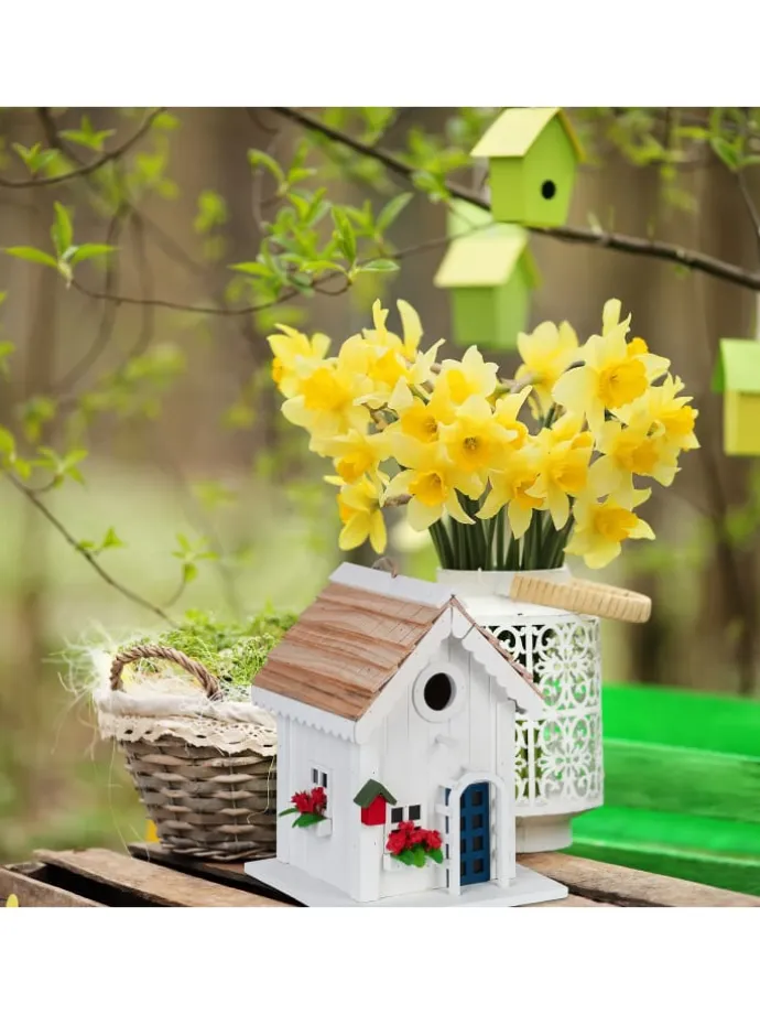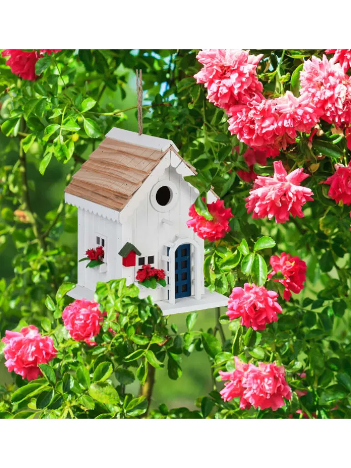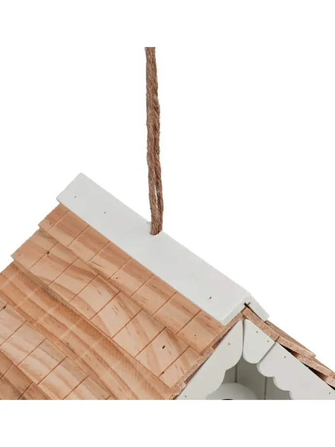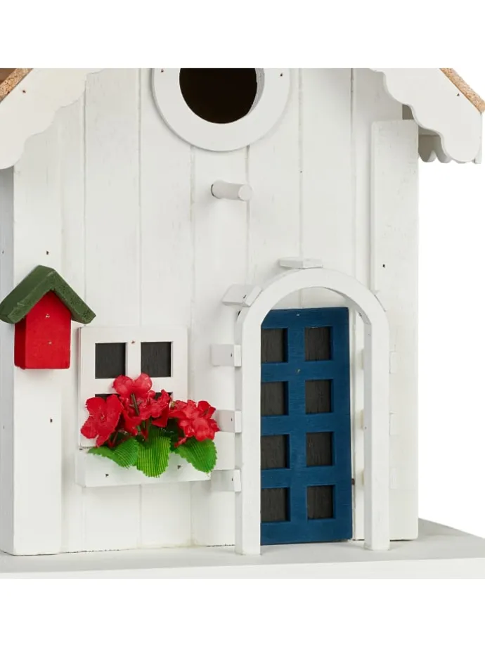 Dieses Deko Vogelhäuschen ist ein kreativer Hingucker für Dein Zuhause. Die Vogelvilla überzeugt mit ihrem tollen und detailreichen Landhausstil und sorgt für eine wohlfühlende Atmosphäre in Deinem Garten, auf Deinem Balkon oder Deiner Terrasse. Dank der praktischen Schlaufe kannst Du das Vogelhäuschen aufhängen. Auch stehend überzeugt das Mini Vogelhaus. Das Holzhaus besteht aus Pappel sowie Kiefer und ist wetterfest. Dadurch hast du lange Freude an der niedlichen Vogelhütte.