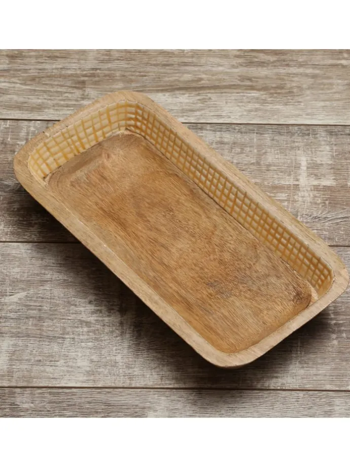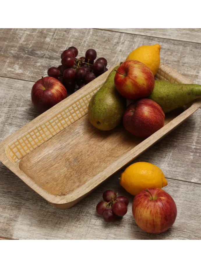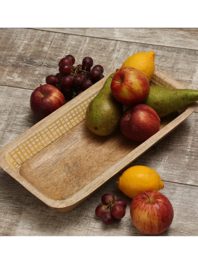 Dekoschale – rechteckig – Mangoholz – L: 40cm – H: 7,5cm – natur, beige Die naturfarbene und mit beigem Rand versehene Dekoschale aus Holz ist genau richtig zum Dekorieren. Kerzen und andere Dekoration sehen auf dem Tablett einfach genial aus.