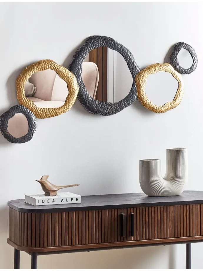 Dekorativer, glamouröser Spiegel. Setzen Sie mit diesem dekorativen Spiegel Akzente an Ihren Wänden. Mit seinem abgerundeten Metallrahmen und der gemusterten Oberfläche ist er ein einzigartiges Accessoire, das dem Raum eine künstlerische Note verleiht. Er ist der perfekte Spiegel für alle Dekorationen, die einen auffälligen Akzent benötigen.