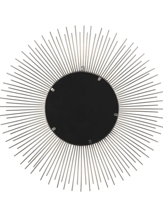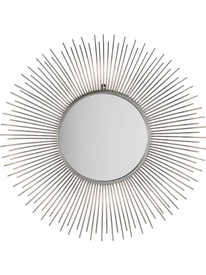 Silberner Spiegel in Sonnenform. Beleben Sie jeden Raum mit dem bezaubernden Aussehen dieses runden Spiegels. Das auffällige Design des Strahlenkranz-förmigen Rahmens passt gut zu eklektischen, Vintage- und Boho-Stilen und schafft einen fröhlichen Akzent in Ihrem Zuhause. Der Wandspiegel kann sowohl als Dekoelement wie auch Schminkspiegel verwendet werden.