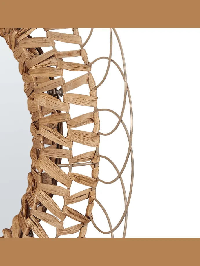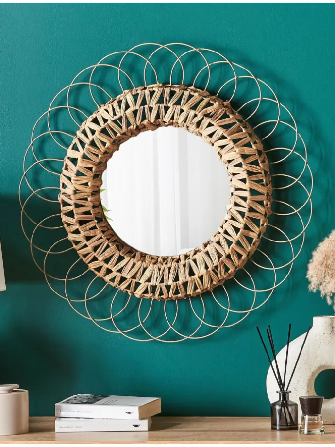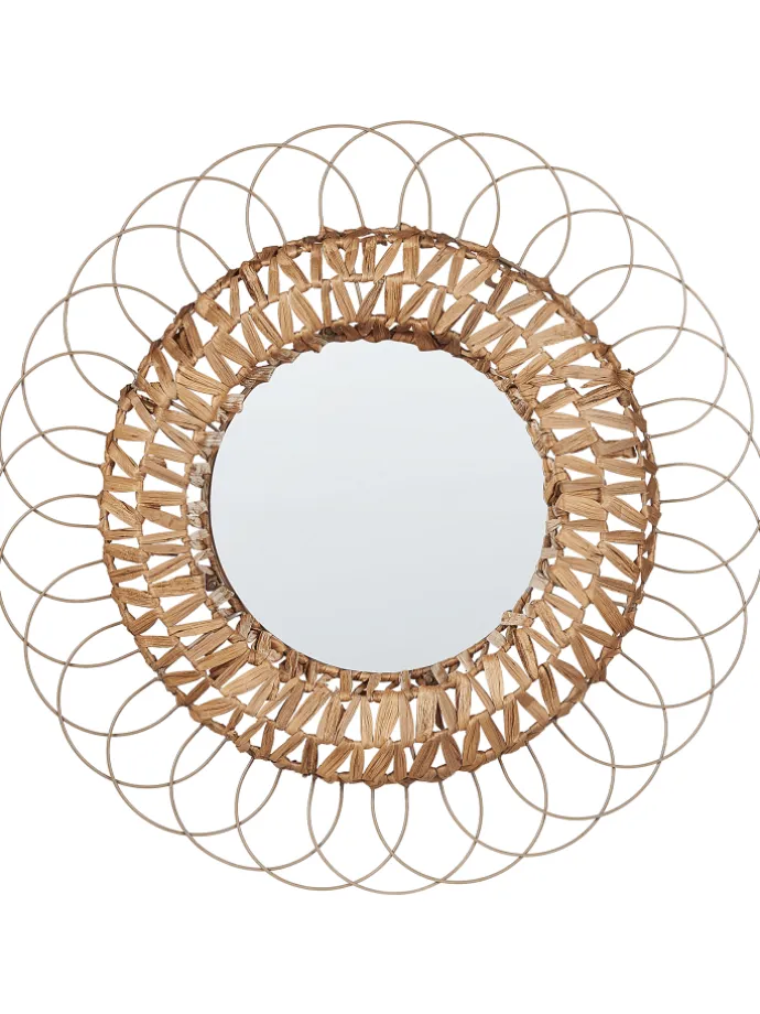 Dekorativer Wandspiegel mit rundem Rahmen. Bringen Sie ein einzigartiges Dekorationsstück in Ihr Zuhause, das sich in jedem Raum gut macht und zudem äußerst funktional ist. Dieser Wandspiegel hat einen dekorativen Metallrahmen, der zusätzlich mit einer Flechtung aus Wasserhyazinthe von Hand verziert worden ist. Das außergewöhnliche Design dieses Accessoires, kombiniert mit dem natürlichen Material und der hochwertigen Verarbeitung, sorgt dafür, dass das Produkt die Aufmerksamkeit aller Gäste auf sich zieht.