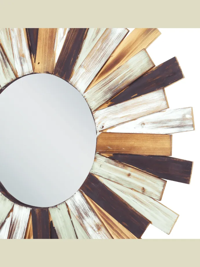 Handgefertigter, runder Spiegel mit breitem Holzrahmen mit mehrfarbigen Akzenten. Setzen Sie auf die handgefertigte Schönheit dieses Hängespiegels und machen Sie Ihre Wände genauso Einzigartig wie er selbst es ist. Er besteht aus verschiedenen Holzstücken, die nicht nur mit ihrer natürlichen Maserung, sondern auch mit den von weiß-, braun- bis grüntönigen Destails auffält. Das handgemalte Sonnen-Design macht ihn zu einen Unikat, das keiner außer Ihnen in seiner Wohnung haben wird. Es liegt ganz bei Ihnen wo Sie Ihn aufhängen werden – ob Wohn-, Schlaf- oder Esszimmer – eins ist Ihnen Gewiss: er wird auf jeden Fall ein stilvoller und funktionaler Blickfang sein.