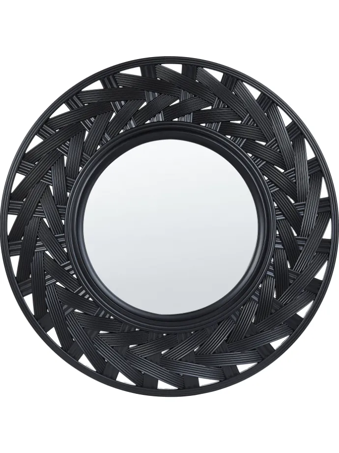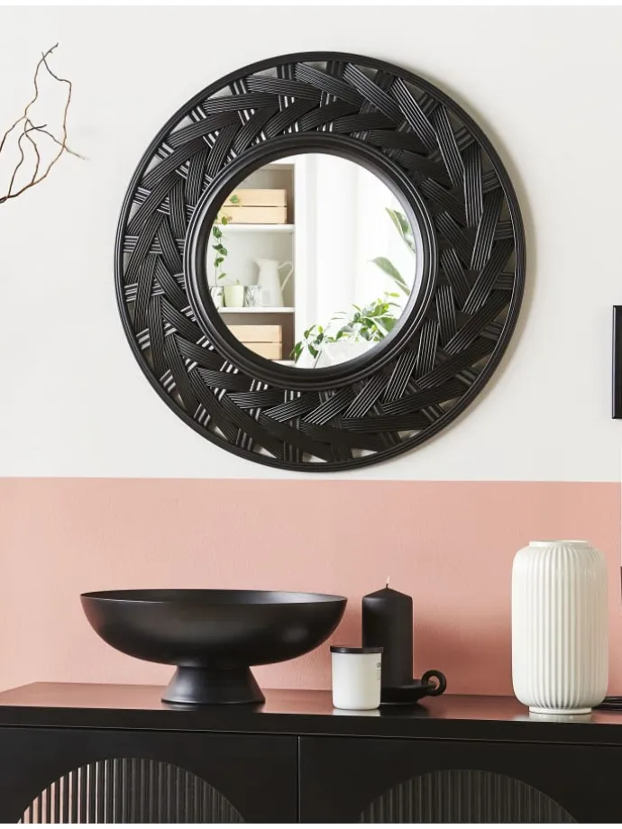 Runder Hängespiegel mit großem Rahmen in Schwarz. Bringen Sie diesen Spiegel in Ihr Wohnzimmer oder Schlafzimmer, um ihnen eine moderne Atmosphäre zu verleihen und sie optisch zu vergrößern. Der Rahmen des Dekorationsstücks ist aus Kunststoff gefertigt und daher pflegeleicht – auch ohne tägliche Reinigung wird der Spiegel jahrelang halten. Außerdem zieht das einzigartige Design des Rahmens die Aufmerksamkeit auf sich und wird zum Eyecatcher in jedem Wohnraum.