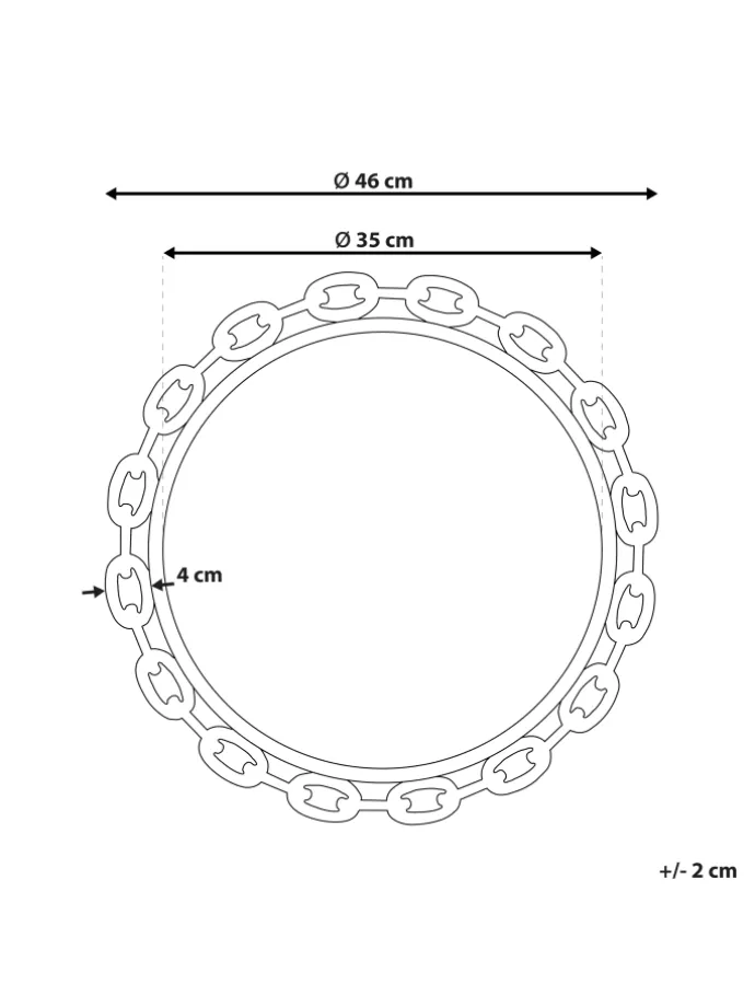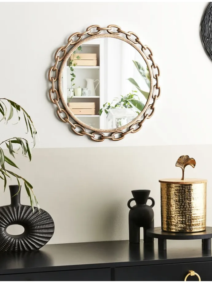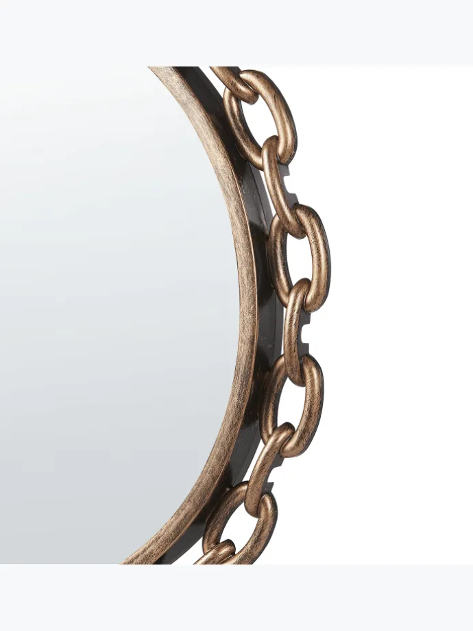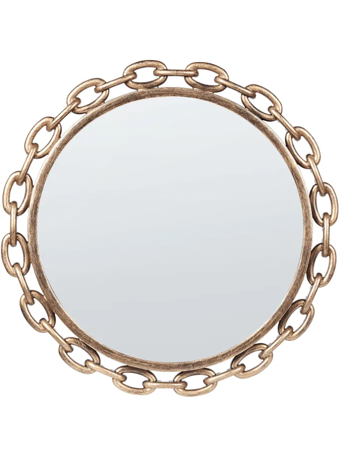 Runder Spiegel mit Kettenrahmen in Gold. Um Ihren Wohnraum zu vervollständigen, benötigen Sie einen dekorativen Spiegel. Dieser Wandspiegel ist aus Kunststoff gefertigt, wodurch er langlebig und pflegeleicht ist. Die goldene Farbe des kettenförmigen Rahmens wurde im Used-Look lackiert, wodurch der Spiegel auffällt und als Eyecatcher dienen kann. Außerdem passt das Dekorationsstück in verschiedene Einrichtungsstile, vom modernen bis zum Retro- und Vintage-Stil.