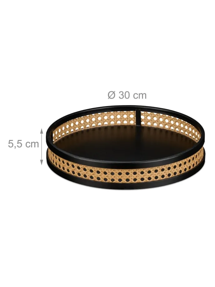 Organisiere und präsentiere Deine Lieblingsstücke mit diesem wunderschönen Dekotablett. Die Holzplatte in Schwarz harmoniert perfekt mit der natürlichen Rattanoptik des Randes und fügt sich so überall ein, ob im Wohnzimmer, Schlafzimmer oder Flur. Dabei fungiert der Dekoteller als Unterlage für Kerzen, Blumen oder Urlaubserinnerungen. Doch das vielseitige Tablett ist mehr als nur Dekoration. Nutze es als stilvolle Aufbewahrung für Deine liebsten Accessoires, wie Schmuck, Make-Up oder Brillen.