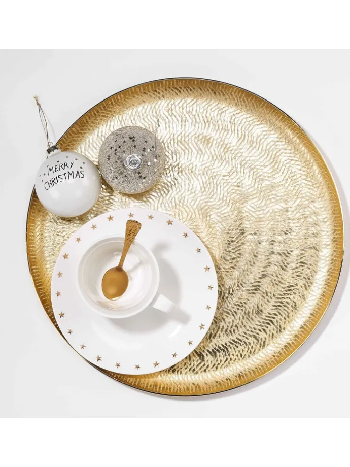 Was unseren GOLDEN STAR Deko-Teller zum Star in Ihrem Zuhause macht? Geriffelte Effekte und der schimmernde Gold-Ton. Der Durchmesser von 38 cm bietet ausreichend Raum für die Verwendung als Dekoschale, Serviertablett, Kerzenteller oder als schicke Aufbewahrung für Schlüssel und mehr. Kreativ dekoriert verschönert der goldene Metallteller die Festtafel und jedes Zimmer zu jeder Jahreszeit.