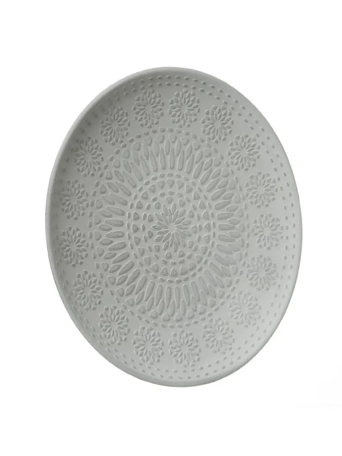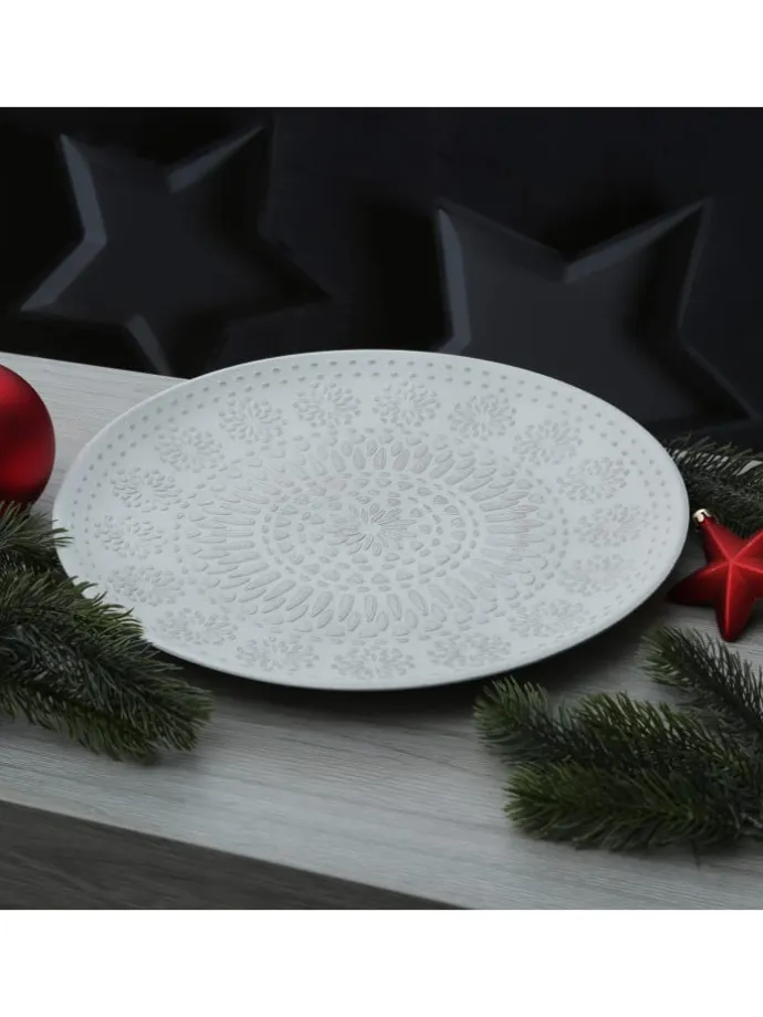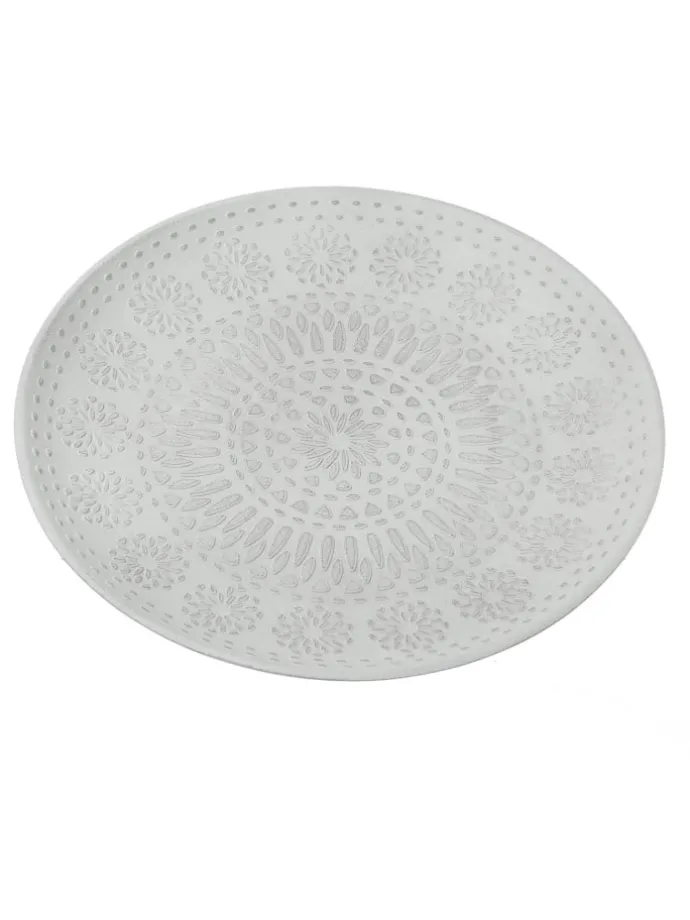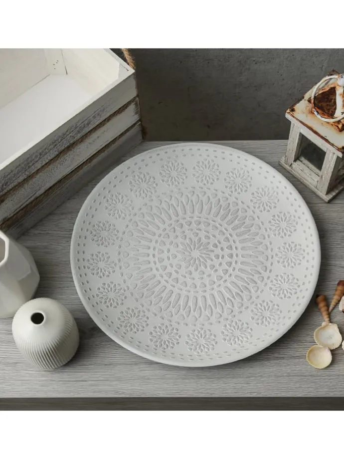 Dekoteller weiß aus MDF Holz mit Ornamentmuster 34,5cm Dieser zeitlose Dekoteller eignet ich hervorragend für kreative Dekoideen. Du kannst hier z.B. Kerzen in Szene setzen, Obst dekorativ anrichten oder Erinnerungsstücke an den Urlaub präsentieren.