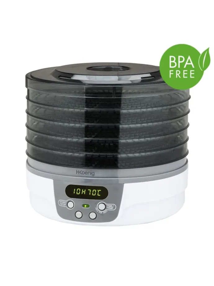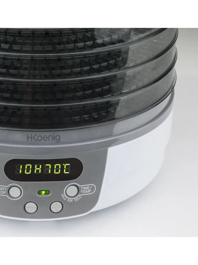 Der Dörrautomat von H.Koenig ist perfekt für die Zubereitung von getrocknetem Obst und Gemüse geeignet. Mit Hilfe des Geräts können Sie alle Aromen und Nährstoffe Ihrer Lebensmittel bewahren und diese auch auch außerhalb der Saison genießen. Ob Obst, Gemüse, Fisch, Fleisch oder Kräuter – der DSY700 von H.Koenig dehydriert alle Arten von Lebensmitteln. Sie können die Temperatur von 40° bis 70° bequem über den LCD-Bildschirm einstellen. Der DSY700 ist besonders effizient dank seiner fünf Trockenschalen und seines Belüftungssystems, das eine gleichmäßige Wärmeverteilung für ein perfektes Ergebnis auf allen Ebenen erlaubt. Der DSY700 von H.Koenig – ideal für eine hauseigene Zubereitung gesunder Snacks für die ganze Familie.250 W220-240 V