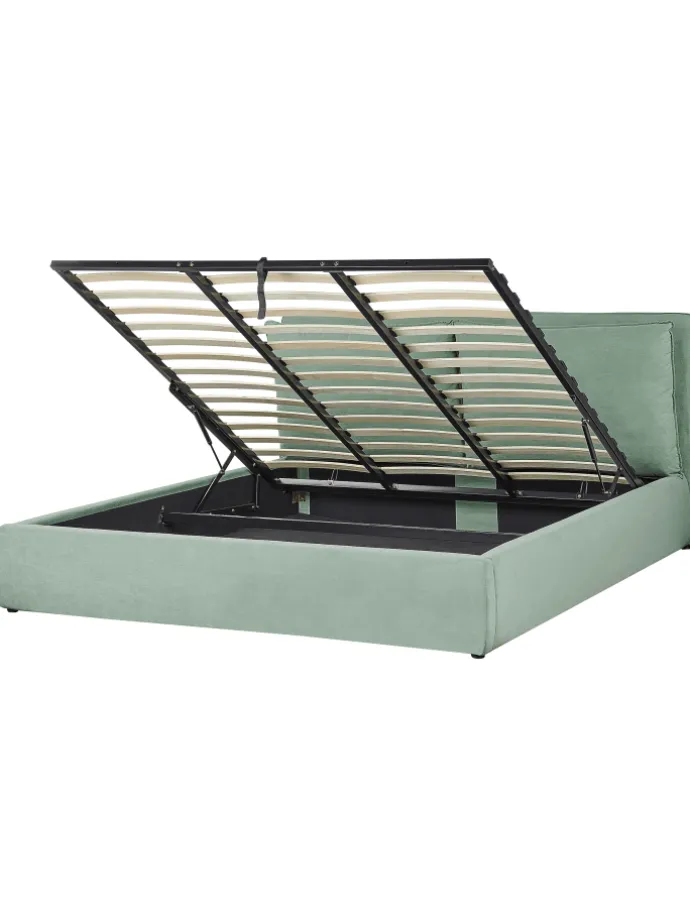 Gepolsterter Bettrahmen mit viel Stauraum, hohem Kopfteil und hochklappbarem Lattenrost. Dieses gepolsterte Bett bringt Ordnung in Ihr Schlafzimmer und sorgt für eine gemütliche Ausstrahlung. Der hochwertige Samtstoff-Bezug ist sehr langlebig und besitzt eine angenehme Haptik. Das hohe, gepolsterte Kopfteil mit den flauschigen Kissen sorgt dafür, dass Sie sich bequem beim Lesen anlehnen können. Dabei lassen sich die Bezüge leicht abnehmen, so ist auch die Pflege der Rückenkissen eine einfache Angelegenheit. Dank dem Stauraum unter dem Lattenrost verstecken Sie die Bettwäsche im Handumdrehen, nutzen dabei die Unterseite des Modells voll aus und haben dabei mehr Platz für andere Schlafzimmermöbel. Der integrierte Lattenrost gibt der Matratze ausreichend Halt, damit Sie sich nach einem anstrengenden Tag voll und ganz entspannen können.