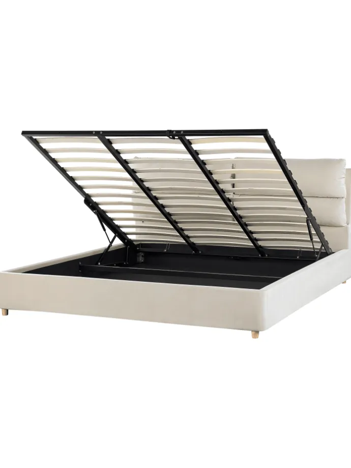 Stoßdämpfende Federholzleisten bieten höchsten Liegekomfort, Fester, integrierter Rahmen für dauerhafte Stabilität, Elegantes Design, Seidenweicher, geschmeidiger Stoff, Praktische Abstellfläche, Leichtes Öffnen des Bettkastens dank Gasdruckfedermechanismus, Rückenkissen mit abnehmbaren Bezügen