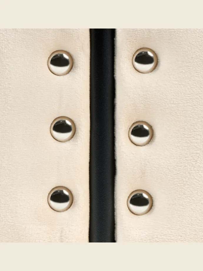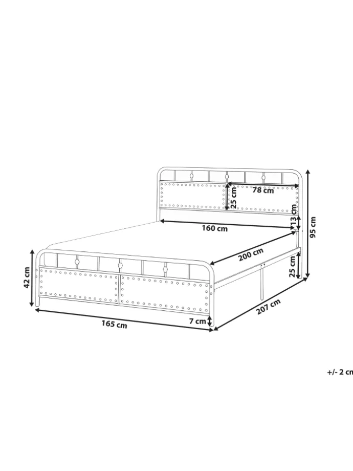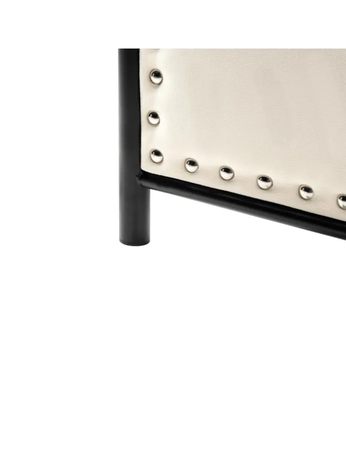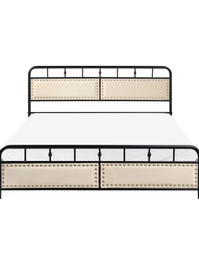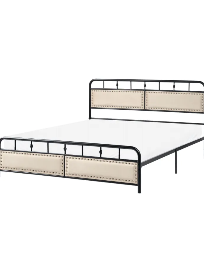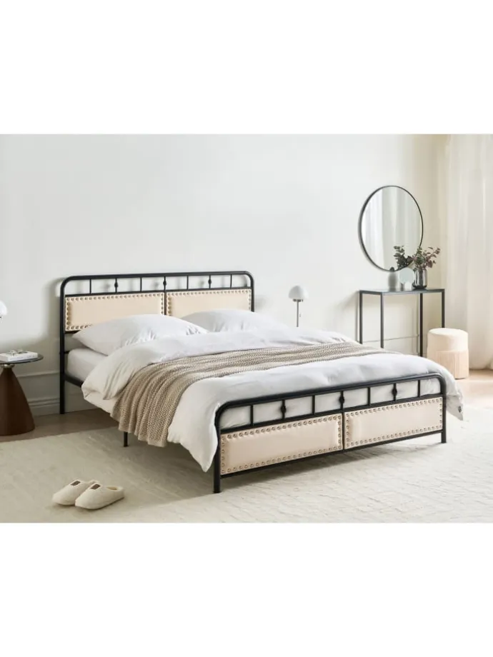 Modernes Metallbett mit Polsterkopfteil, Nieten und Metallrost. Dieses stilvolle Doppelbett besteht nicht nur aus robustem Metall, sondern verfügt auch über einzigartige gepolsterte Paneele am Kopf- und Fußteil, die mit einer dekorativen Nietenumrandung verschönert sind. So verleiht das Polster-Metallbett Ihrem Schlafzimmer sowohl einen industriellen Charme als auch etwas Gemütlichkeit. Der schwarz bemalte Metallrahmen punktet genauso wie der integrierte Metallrost, mit seiner Langlebigkeit und Pflegeleichtigkeit. Zudem besitzt das Bett eine komfortable Einstiegshöhe, die das Zubettgehen zu einem Genussmoment macht.