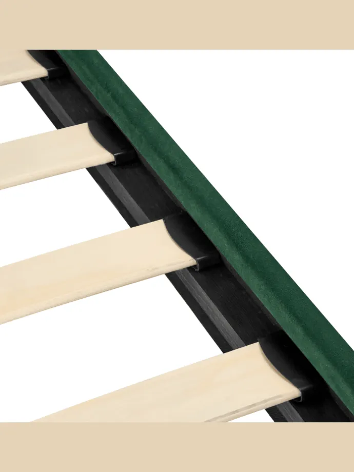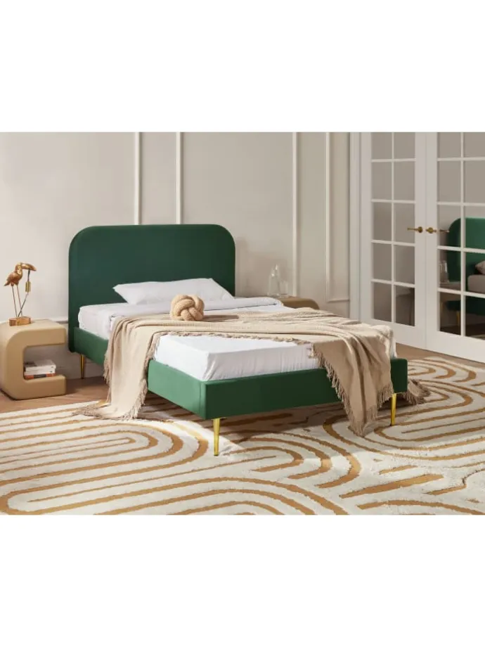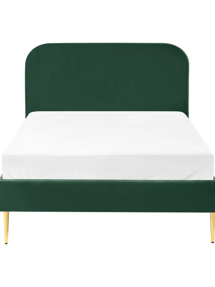 Bequemes Samtbett in edlem Dunkelgrün. Dieses gemütliche Bett besticht mit seiner eleganten Gestaltung in edlem Dunkelgrün und ist eine hervorragende Ergänzung zu Ihrer Einrichtung. Gefertigt aus widerstandsfähigem Holz, bezogen mit edlem hochwertigem Samt strahlt es Wärme und Behaglichkeit aus. Das hohe Kopfteil mit abgerundeten Ecken sorgt für extra Komfort, die grazil wirkenden Beine geben Stabilität und unterstreichen das moderne Design.