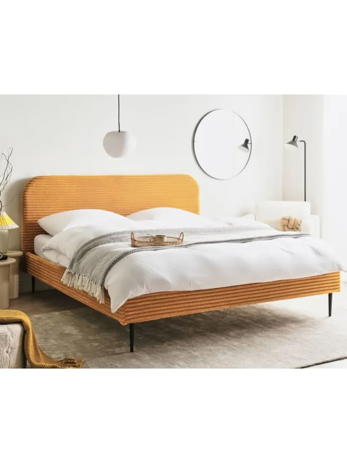 Modernes Bettgestell aus Cord. Verwandeln Sie Ihr Schlafzimmer mit diesem eleganten und einladenden Bett, das eine gemütliche und stilvolle Atmosphäre schafft. Bezogen mit weichem Breitcord mit einer samtigen Haptik, verleiht es dem Raum Wärme und Charakter. Der stabile Lattenrost aus Massivholz sorgt für optimalen Halt und einen erholsamen Schlaf, während die schlanken schwarzen Beine einen modernen Akzent setzen und für Stabilität sorgen. Ein stilvolles Statement-Stück für Ihr Zuhause.