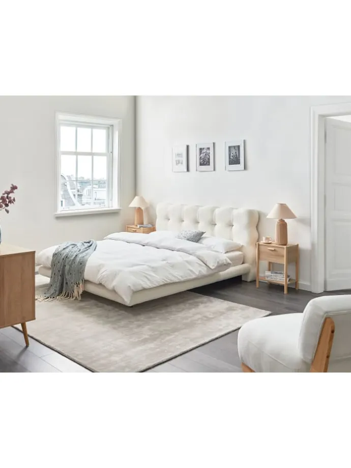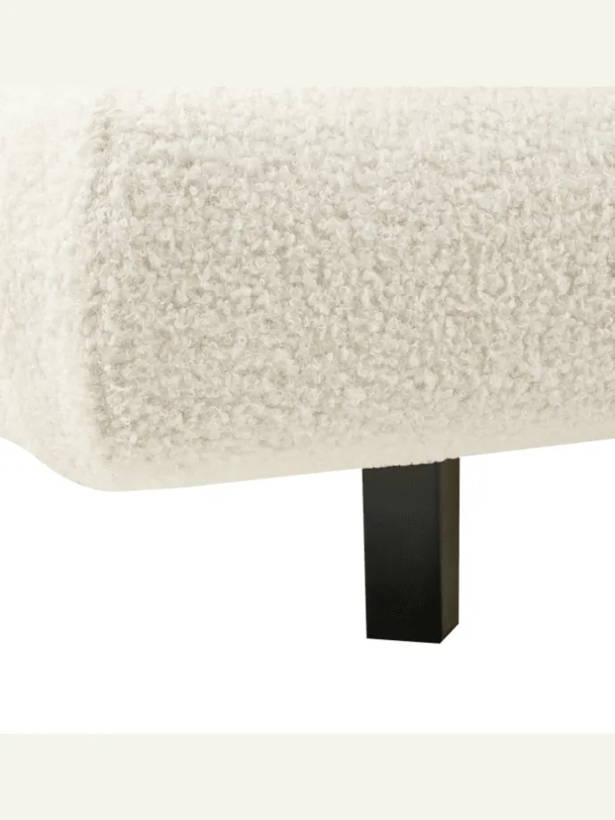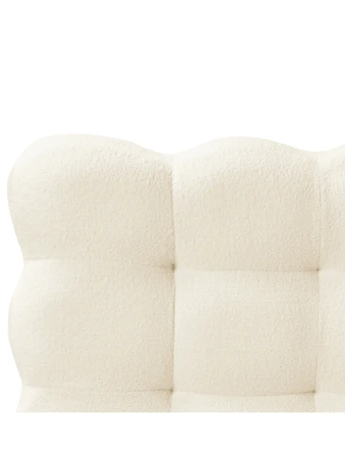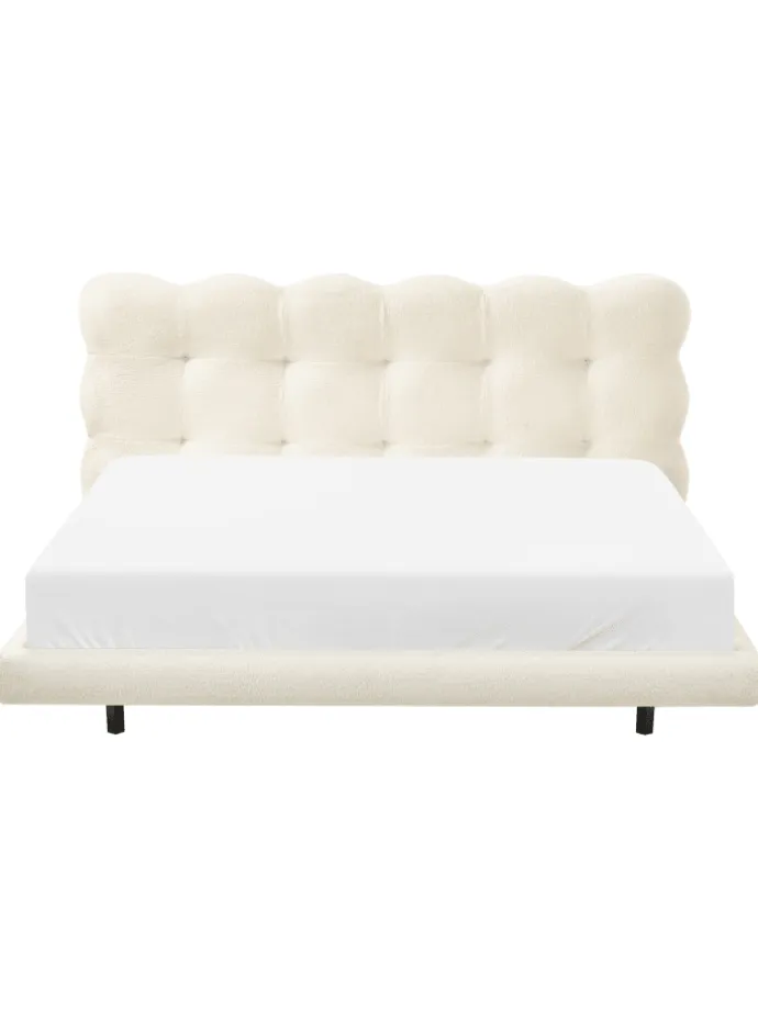 Polsterbett mit niedrigem Rahmen und gestepptem Kopfteil. Verwandeln Sie Ihr Schlafzimmer in eine stilvolle Wohlfühloase mit diesem eleganten und niedrigen Bettgestell. Der Rahmen ist mit weichem Bouclé-Stoff bezogen, während das gepolsterte, gesteppte Kopfteil für hohen Komfort und eine moderne, minimalistische Note sorgt. Dank des stabilen Lattenrosts und der robusten Metallbeine bietet dieses Bett nicht nur optisch, sondern auch funktional eine ideale Schlaflösung – passend für verschiedenste Einrichtungsstile.