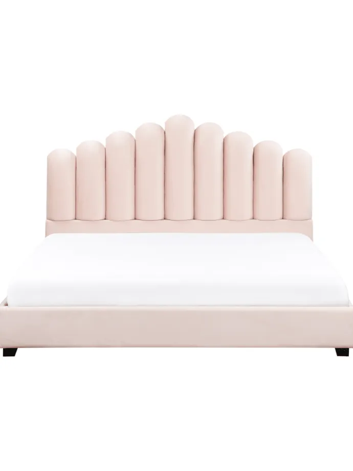 Samtbett mit muschelförmigem Kopfteil. Bringen Sie mit diesem wundervollen Bett ein bisschen Luxus in Ihr Schlafzimmer. Der Holzrahmen ist vollständig mit einem seidig-weichen Bezug aus Samtstoff in einem edlen Pastellrosa-Ton überzogen. Das Polsterbett verfügt über ein wunderschönes Kopfteil, das einer Muschel ähnelt und dem Bett einen glamourösen Touch verleiht. Zudem ist der Bettrahmen mit einem robusten Lattenrost ausgestattet. Schick und stilvoll, wird das Samtbett zum wahren Schmuckstück in jedem modernen Wohnraum.