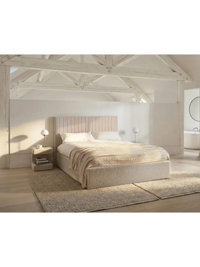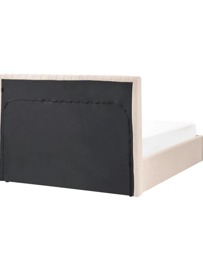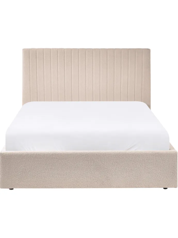 Modernes Stauraumbett mit hohem Kopfteil. Holen Sie sich dieses Polsterbett in Ihr Schlafzimmer und genießen Sie einen ruhigen, erholsamen Schlaf. Das Möbelstück ist mit hochwertigem Bouclé bezogen, wodurch es sich angenehm anfühlt und pflegeleicht ist. Das hohe, gesteppte Kopfteil unterstreicht das Design des Möbelstücks und erhöht den Nutzungskomfort. Unter dem Holzrahmen befindet sich ein Stauraum, der sich leicht mithilfe der praktischen Gasdruckfeder öffnen lässt, damit Sie Ihre zusätzlichen Kissen, Bettwäsche oder Schlafanzüge bequem aufbewahren können.