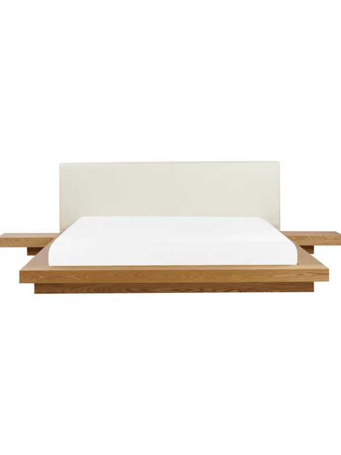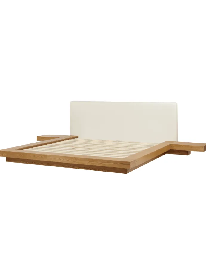 Exklusives Bett im japanischen Stil. Großzügig, komfortabel und mit klaren Linien bringt dieses herrlich komfortable und elegante Futonbett im japanischen Stil Ruhe und Ausgeglichenheit in Ihr Schlafzimmer. Der natürliche, warme Holzfarbton harmonisiert ausgezeichnet mit dem weißen Kunstleder der beiden Kopfteile und den zwei, flachen Nachttischen an den Seiten. Der stabile Lattenrost sorgt zusätzlich für eine perfekte Klimatisierung.