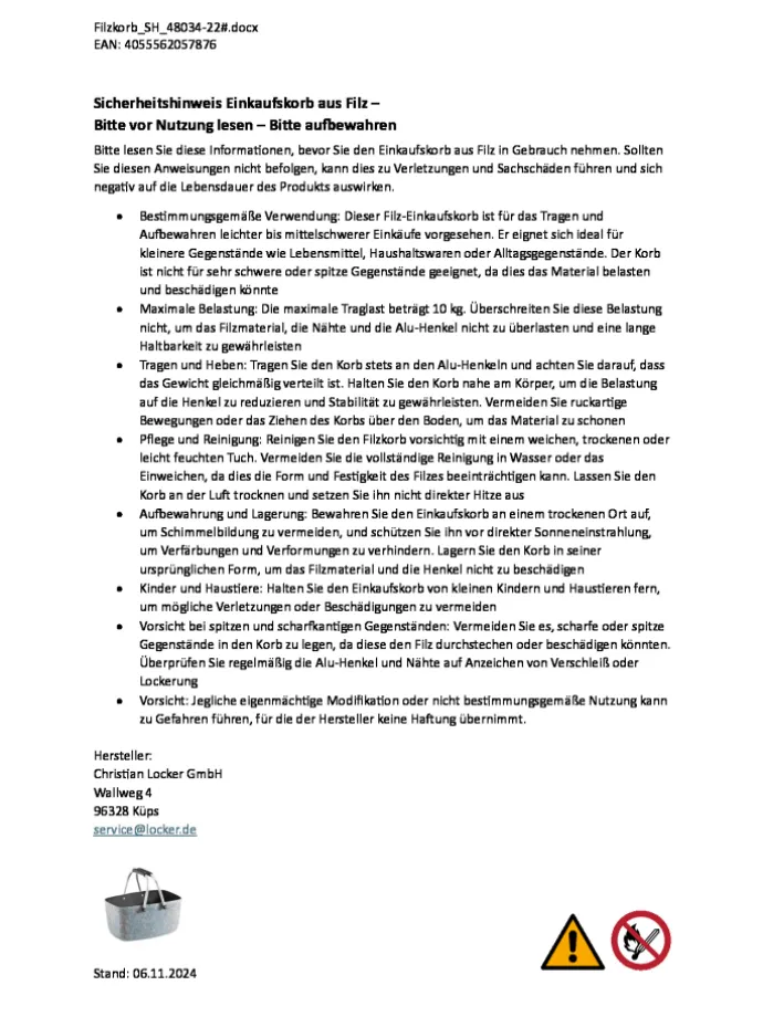 EINFACH Praktisch – Unser geräumiger Filzkorb von Kobolo im modernen Design. ALLROUNDER – Zum Einkaufen, für Flaschenpfand oder zur Aufbewahrung von Zeitungen oder Kleinigkeiten. BESTÄNDIKEIT – Dieser treue Begleiter kann vielseitig eingesetzt werden und hält bei einer Belastbarkeit bis 8 kg auch bei schwereren Einkäufen stand. Lieferung ohne Deko und Inhalt