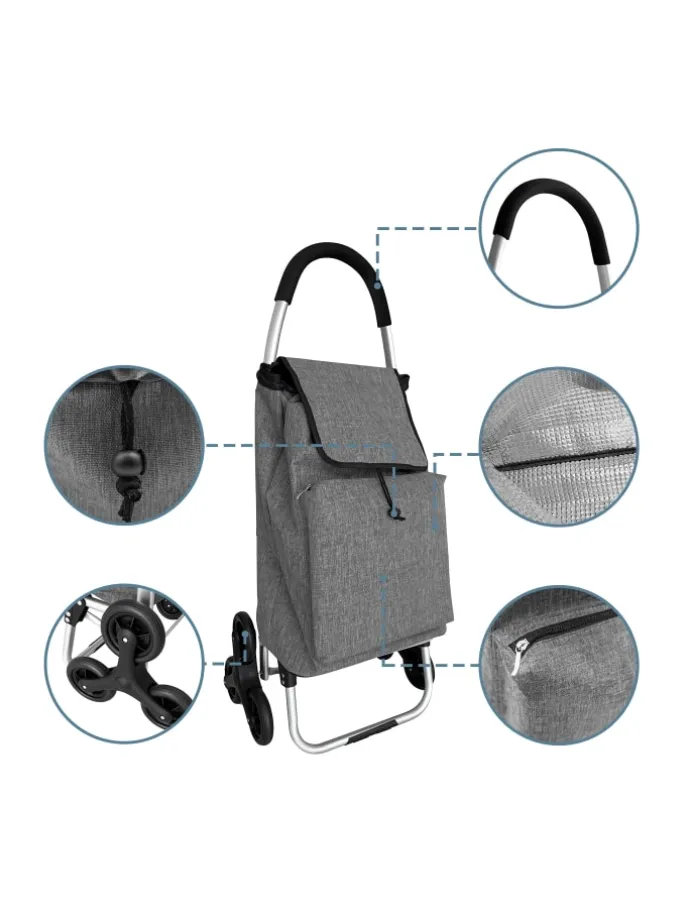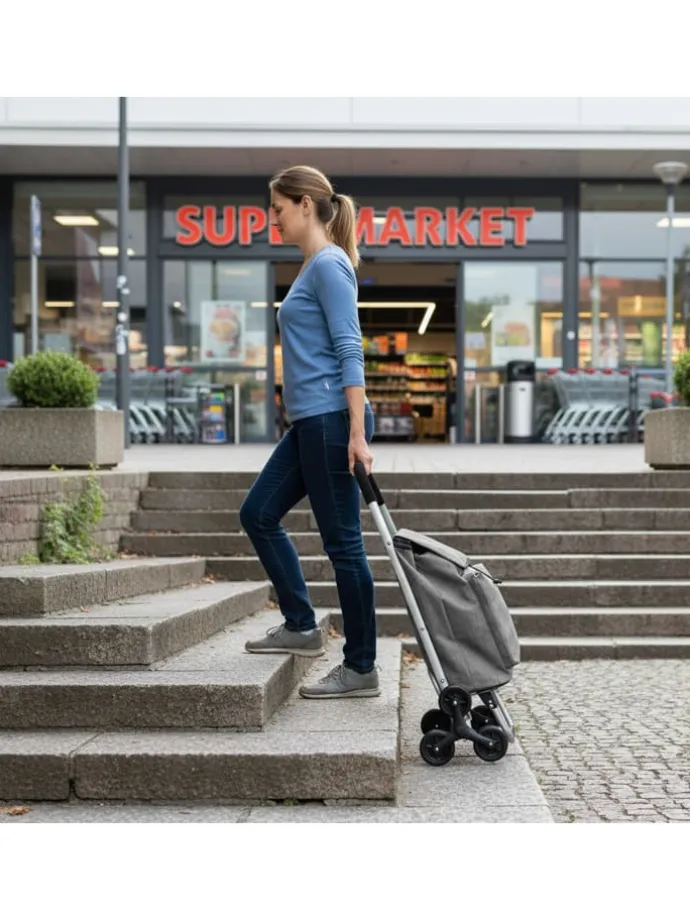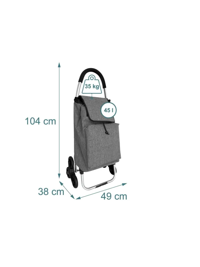 Der Shopping-Trolley ist der perfekte Begleiter für Deinen Einkaufsbummel. Mit seinem großen Fassungsvermögen und der hohen Traglast bietet der Einkaufsroller ausreichend Platz für Deinen Wocheneinkauf und verfügt zudem über eine integrierte Kühltasche. Die Treppensteigerräder ermöglichen Dir einen mühlelosen Transport über Stufen. Dank der abnehmbaren Tasche kann der Trolley auch als Sackkarre für Getränkekisten und andere schwere Gegenstände verwendet werden.