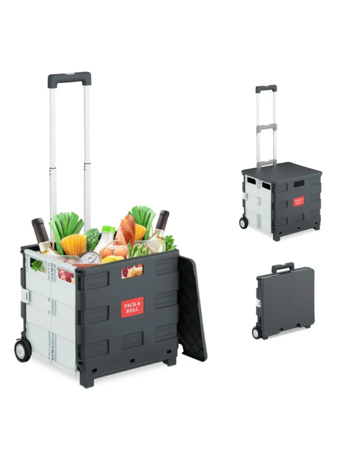 Der Klapptrolley ist der perfekte Begleiter für Deinen Einkaufsbummel. Mit seinem großen Fassungsvermögen und der hohen Traglast bietet der Shopping-Trolley ausreichend Platz für Deine Einkäufe. Der praktische Deckel schützt dabei vor Wettereinflüssen. Dank der Rollen und des Teleskopgriffs kannst Du den Einkaufswagen bequem und rückenschonend hinter Dir herziehen. Nach der Benutzung lässt sich der Transporttrolley mit wenigen Handgriffen platzsparend zusammenfalten und verstauen.