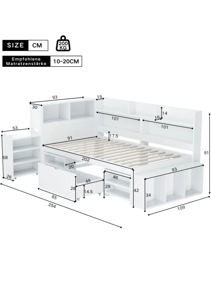 Versteckter Stauschrank am Kopfende des Bettes, eine Schublade an der Seite des Bettes und Schränke um das Bett herum, in denen verschiedene Gegenstände wie Kleidung, Spielzeug, Bücher usw. aufbewahrt werden können.